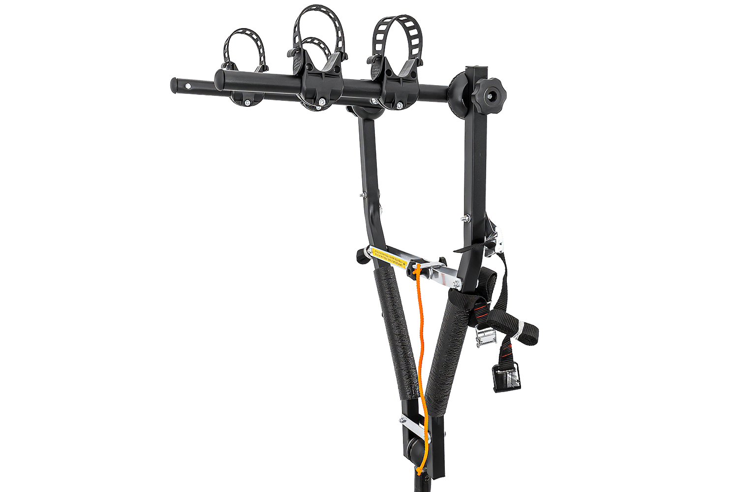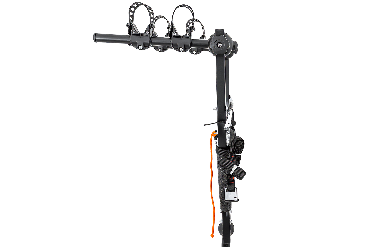 Remarque : Le porte-vélos ne comprend pas d'éclairage supplémentaire, et les vélos installés peuvent masquer les éclairages et la plaque d'immatriculation. Pour plus de sécurité, nous vous recommandons d'acheter une plaque d'immatriculation avec éclairage. Elle se fixe au vélo supérieur à l'aide de sangles.
