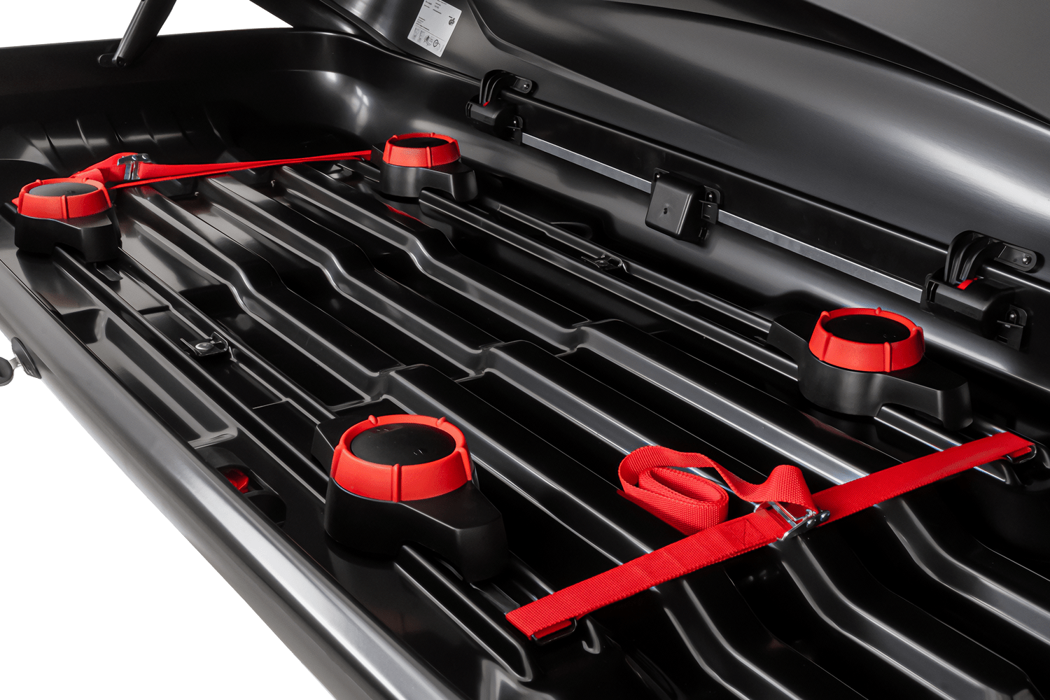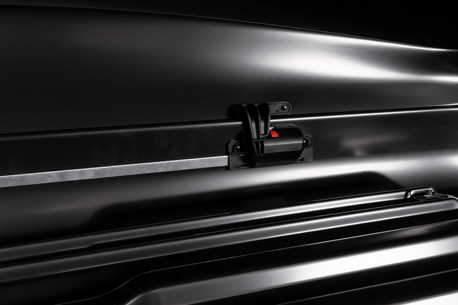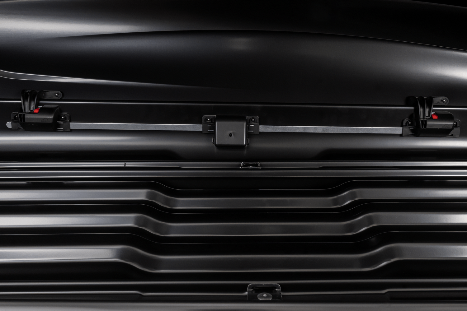 Sa forme aérodynamique réduit le bruit de conduite et la consommation de carburant. Le système d'ouverture à double sens facilite l'accès depuis tous les côtés du véhicule, tandis que des vérins à ressort stabilisent le couvercle et améliorent son étanchéité. Un système de verrouillage centralisé à trois points verrouille le coffre en plusieurs points, et la clé ne peut être retirée qu'une fois correctement fermée, ce qui renforce la sécurité.