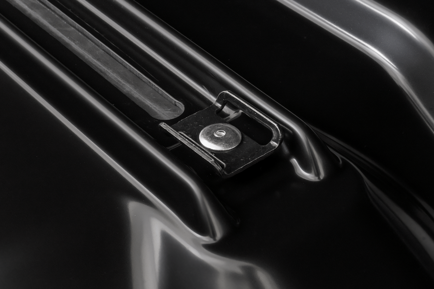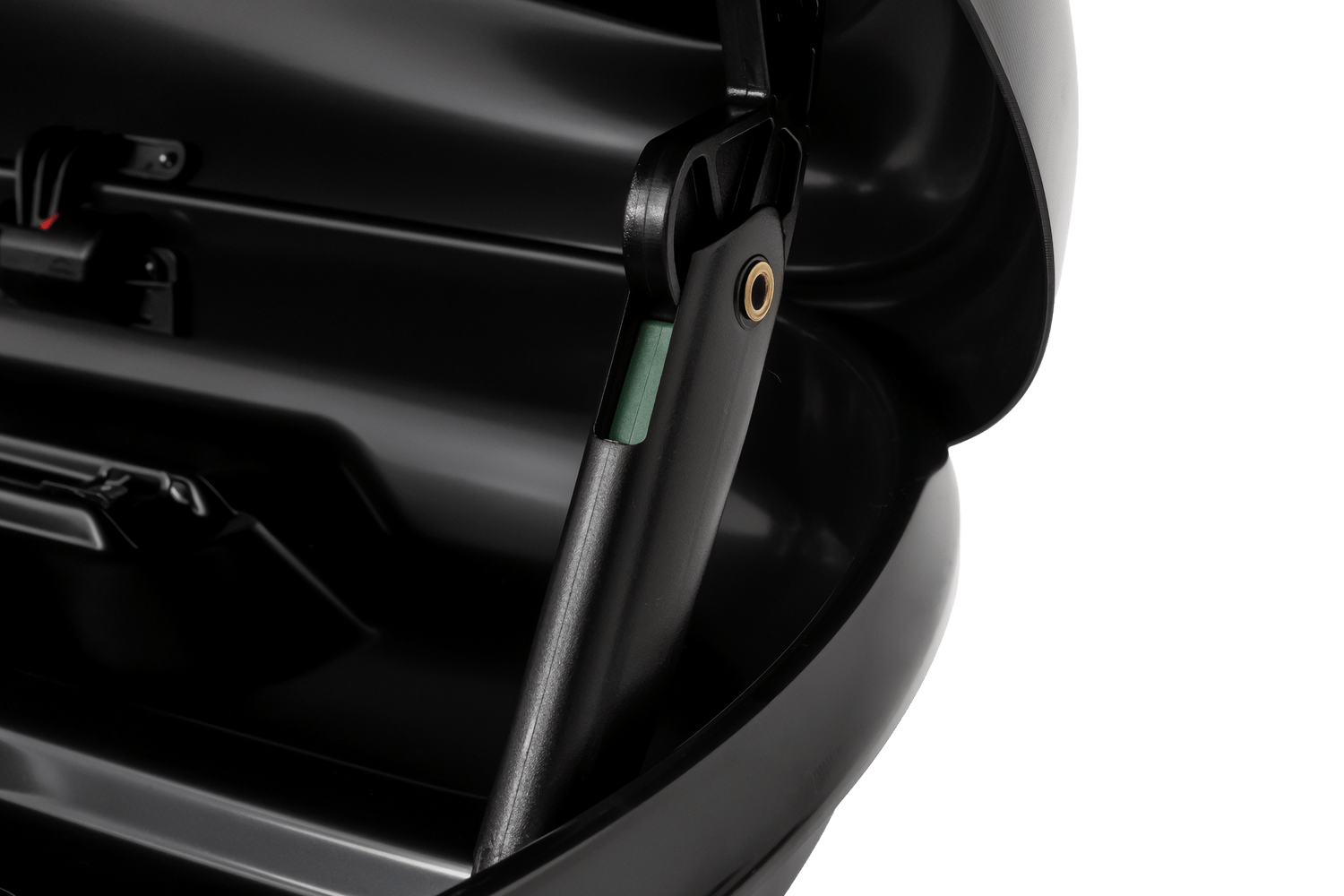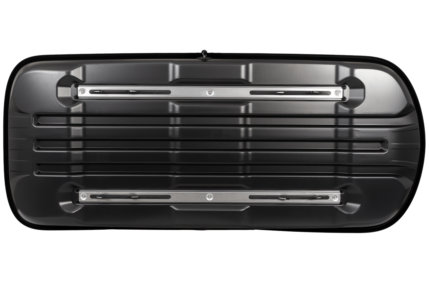 Sa forme aérodynamique réduit le bruit de conduite et la consommation de carburant. Le système d'ouverture à double sens facilite l'accès depuis tous les côtés du véhicule, tandis que des vérins à ressort stabilisent le couvercle et améliorent son étanchéité. Un système de verrouillage centralisé à trois points verrouille le coffre en plusieurs points, et la clé ne peut être retirée qu'une fois correctement fermée, ce qui renforce la sécurité.