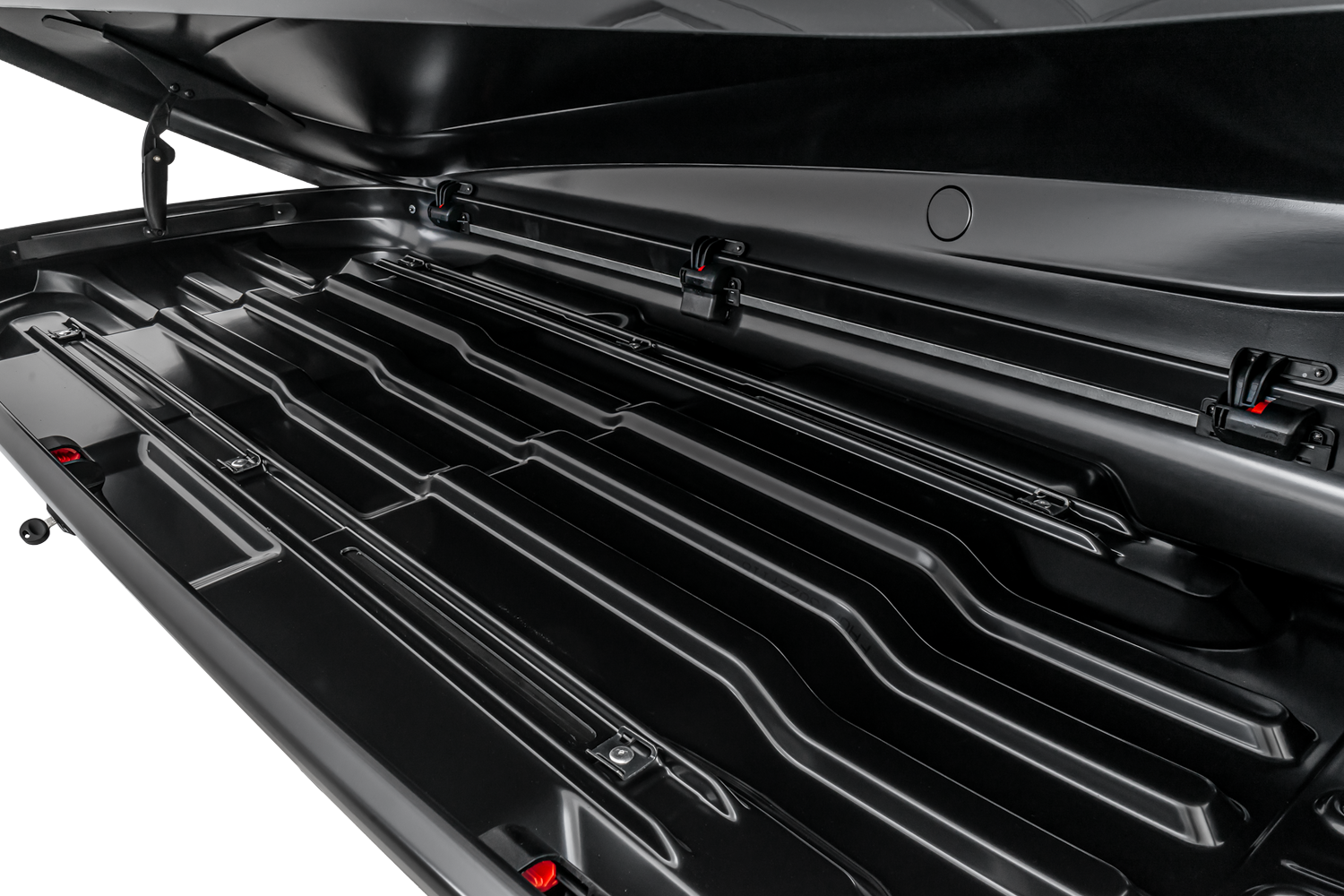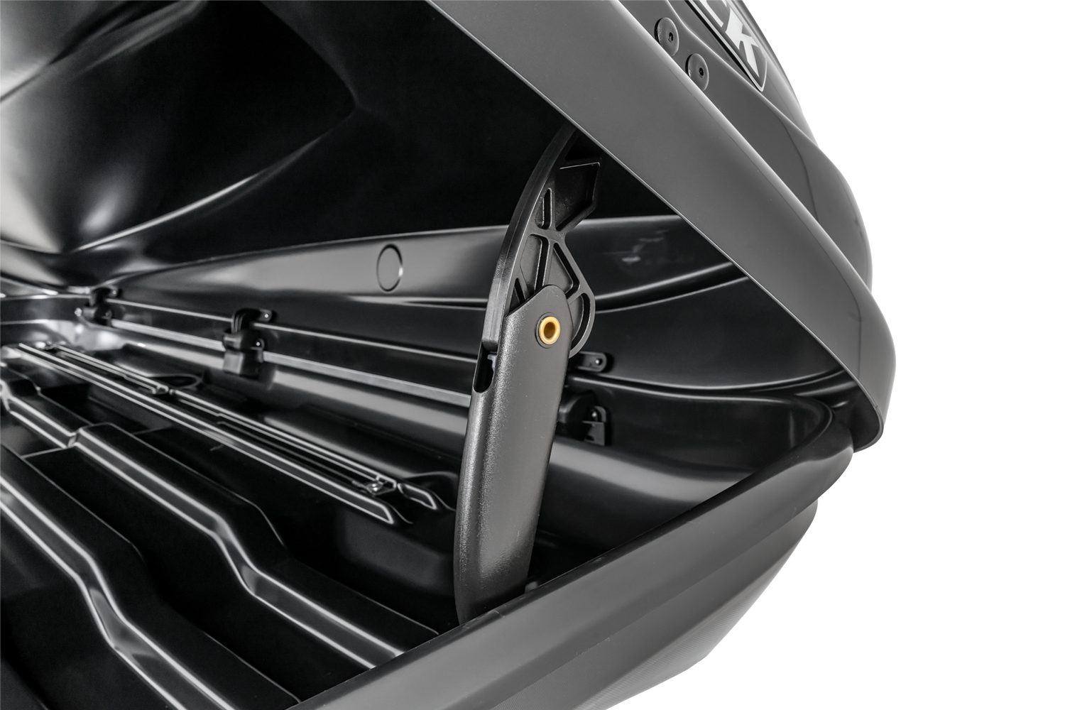Grâce au système d'ouverture bidirectionnelle, vous accédez facilement à l'intérieur depuis n'importe quel côté du véhicule. Des vérins maintiennent le couvercle en position stable pendant le chargement et le resserrent lors de la fermeture, améliorant ainsi l'étanchéité. Un système de verrouillage central à trois points verrouille le coffre en plusieurs points, et la clé ne peut être retirée qu'une fois correctement fermée, ce qui renforce la sécurité du transport.