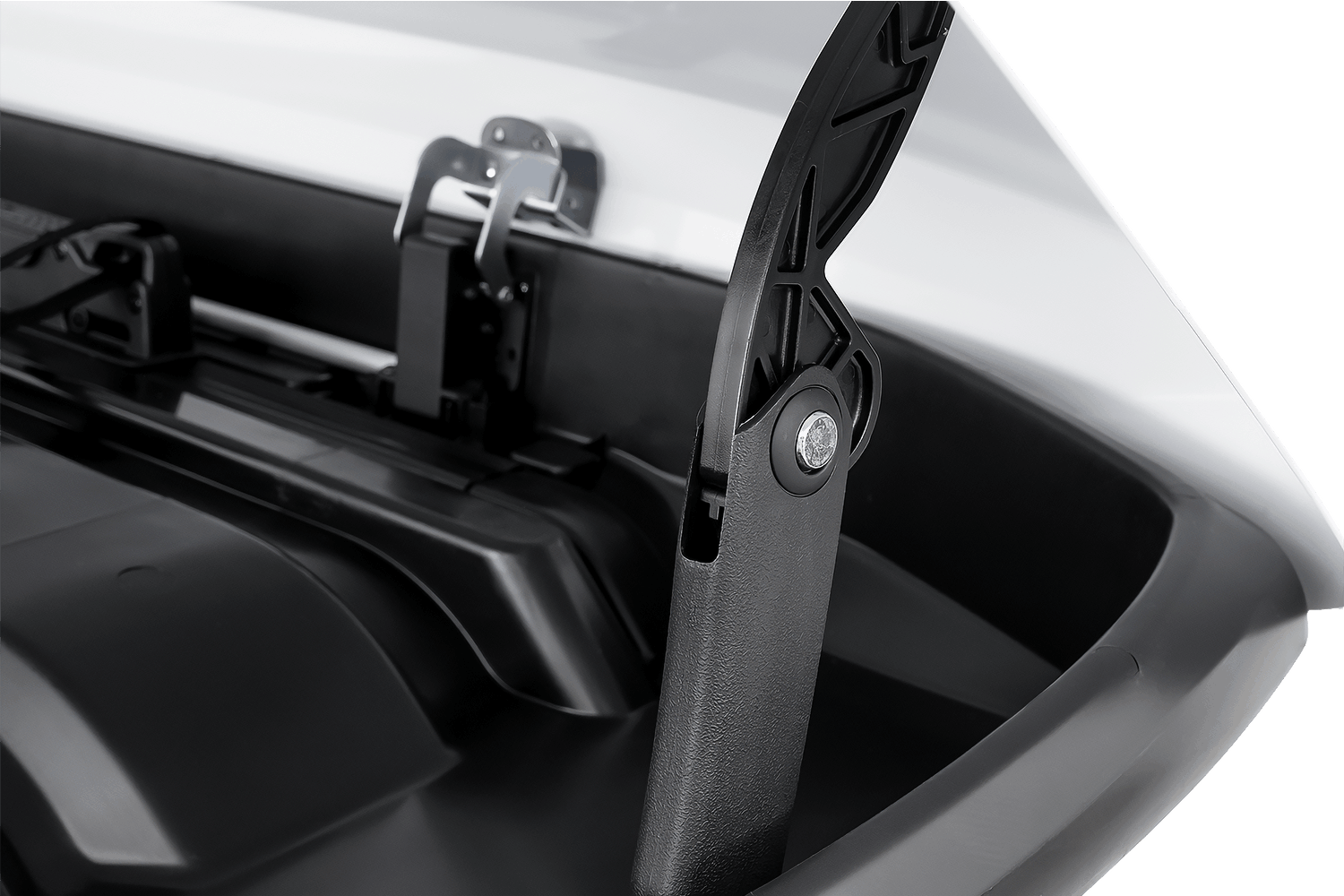 Skugga se distingue par son design moderne et sa construction robuste en ABS de haute qualité, résistant aux UV et aux intempéries. Il ne pèse que 19 kg et offre une capacité de charge de 75 kg. Son fond a été spécialement profilé et renforcé pour une durabilité accrue. Son système d'ouverture bilatérale facilite le chargement, tandis que son verrouillage centralisé trois points, avec système SNAP LOCK, garantit la sécurité : un bouton de verrouillage s'ouvre lorsque le couvercle est correctement fermé, indiquant ainsi qu'il est prêt à partir.