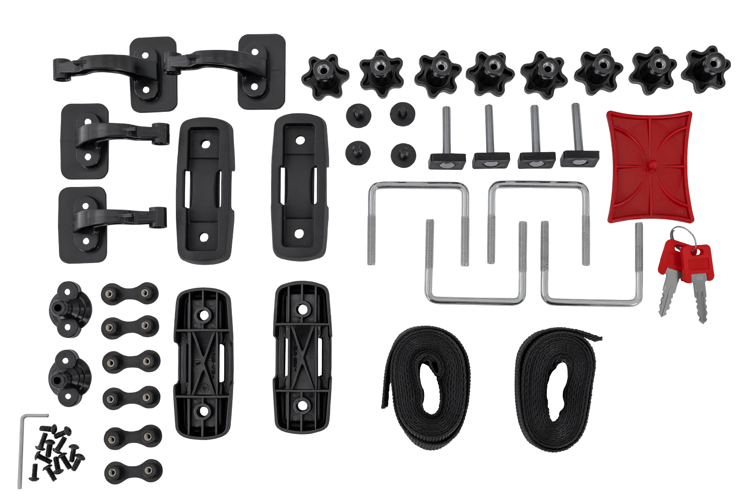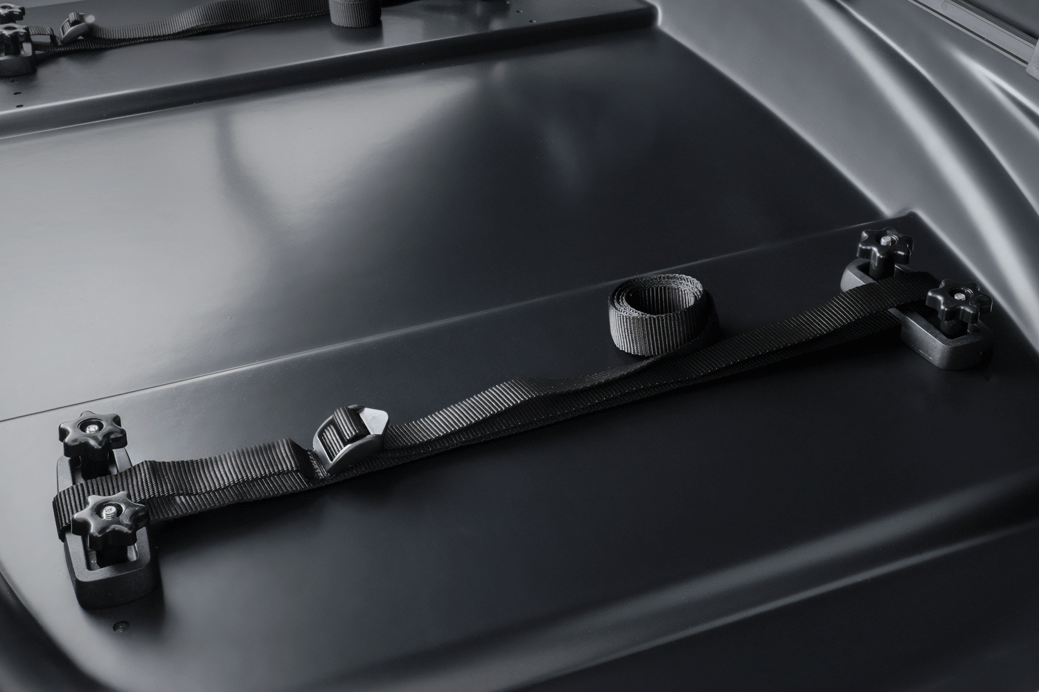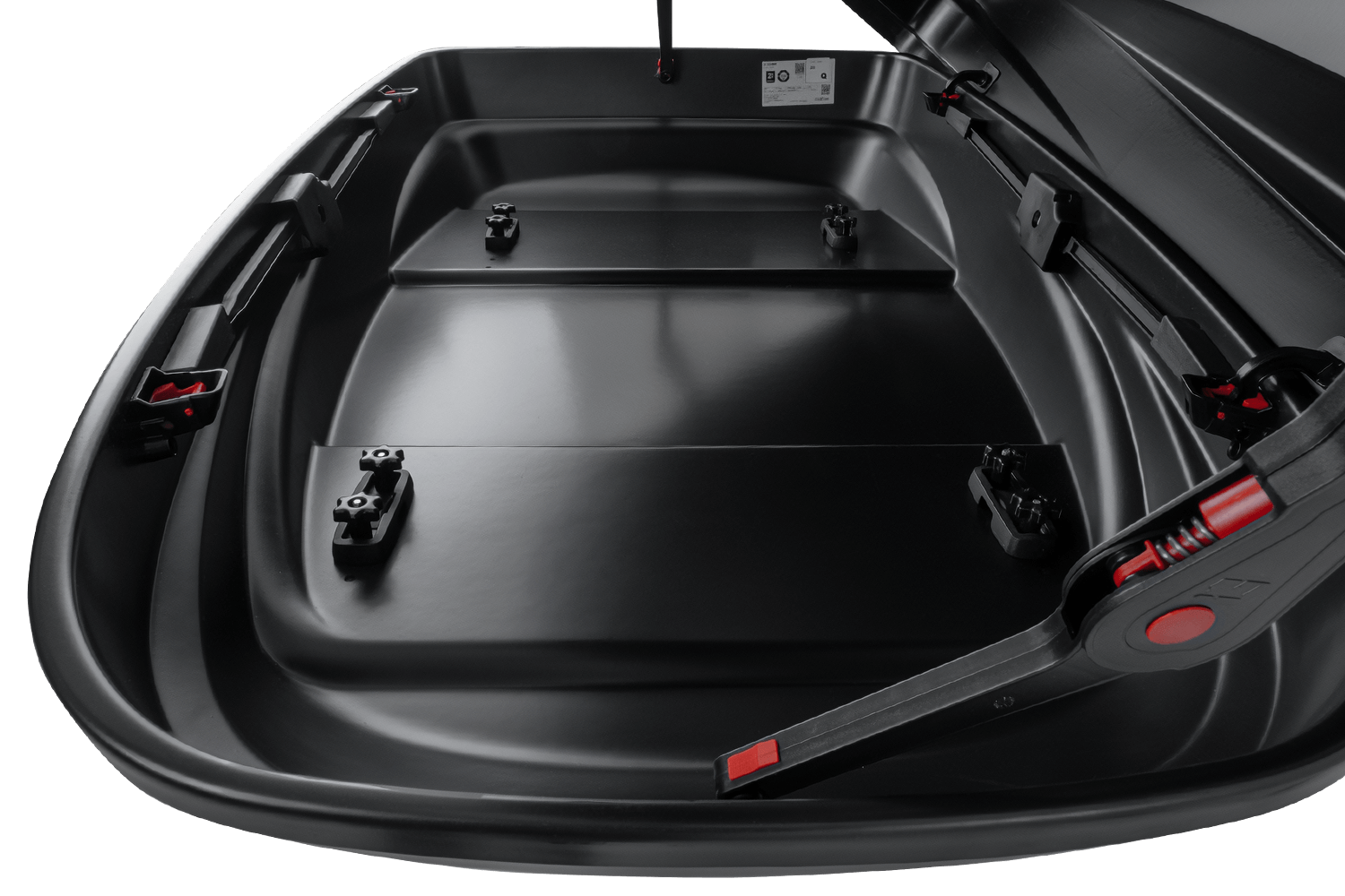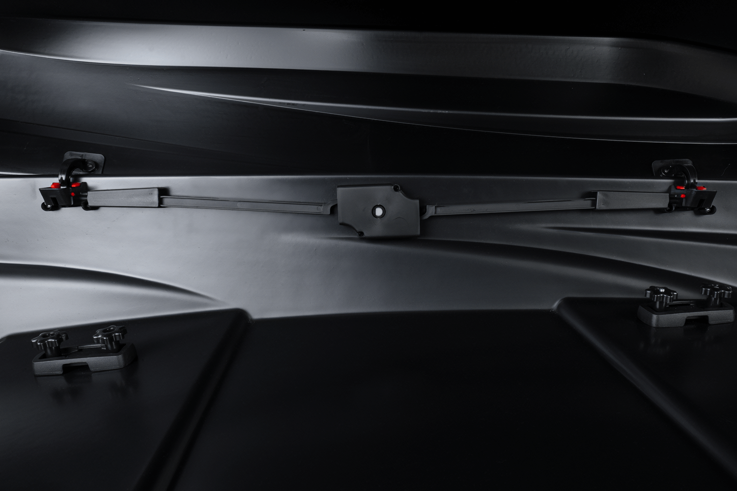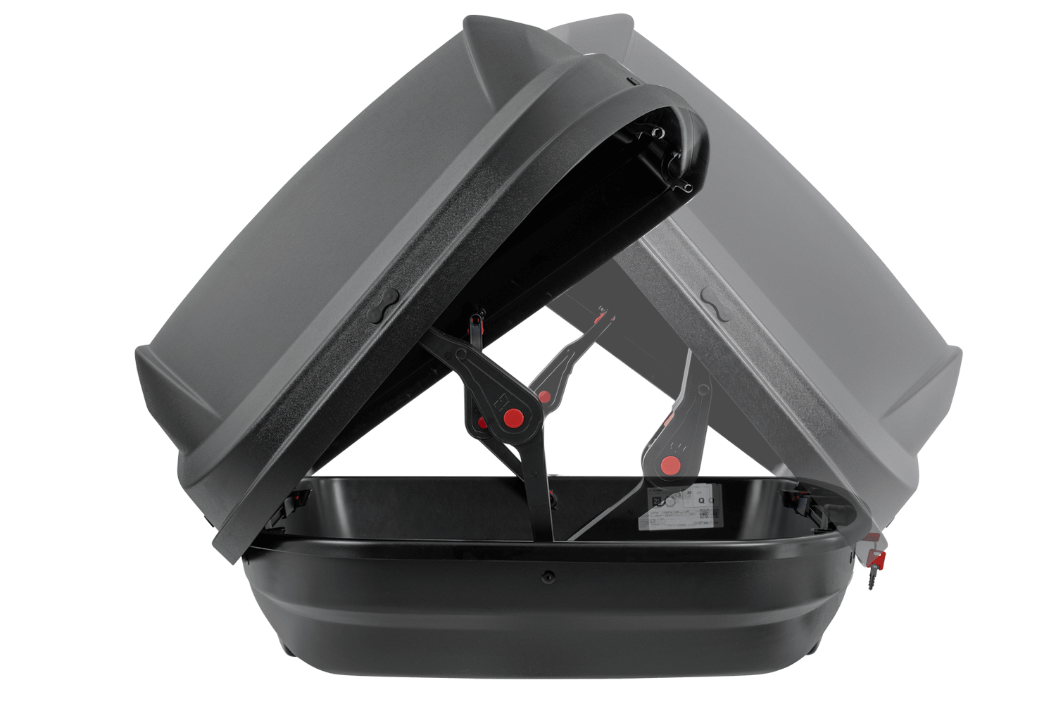Le couvercle s'ouvre des deux côtés et est soutenu par des vérins à ressort qui assurent un levage facile et stable. Un système de verrouillage centralisé à deux points assure la sécurité de vos bagages. La construction de la boîte est réalisée dans un matériau résistant aux UV et aux températures extrêmes, garantissant ainsi sa longévité.