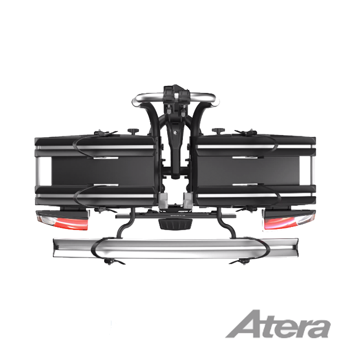 - L'Atera Genio PRO, avec son mécanisme de pliage unique, a perfectionné un porte-vélos compact pour un transport sécurisé des vélos. L'innovation réside dans la rotation des ailes latérales. Une fois repliées, elles se replient vers l'intérieur, protégeant ainsi les feux et orientant le côté transparent des ailes vers l'extérieur. Un rail vélo supplémentaire (adaptateur) peut être fixé et fixé sans outils à l'aide de grandes vis à oreilles.