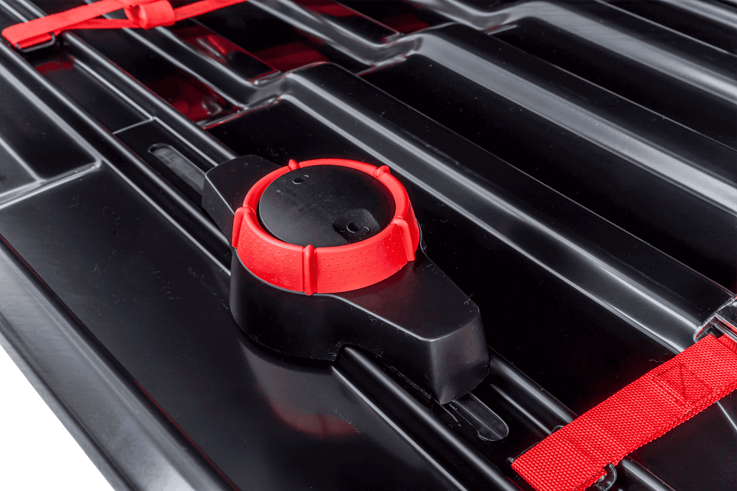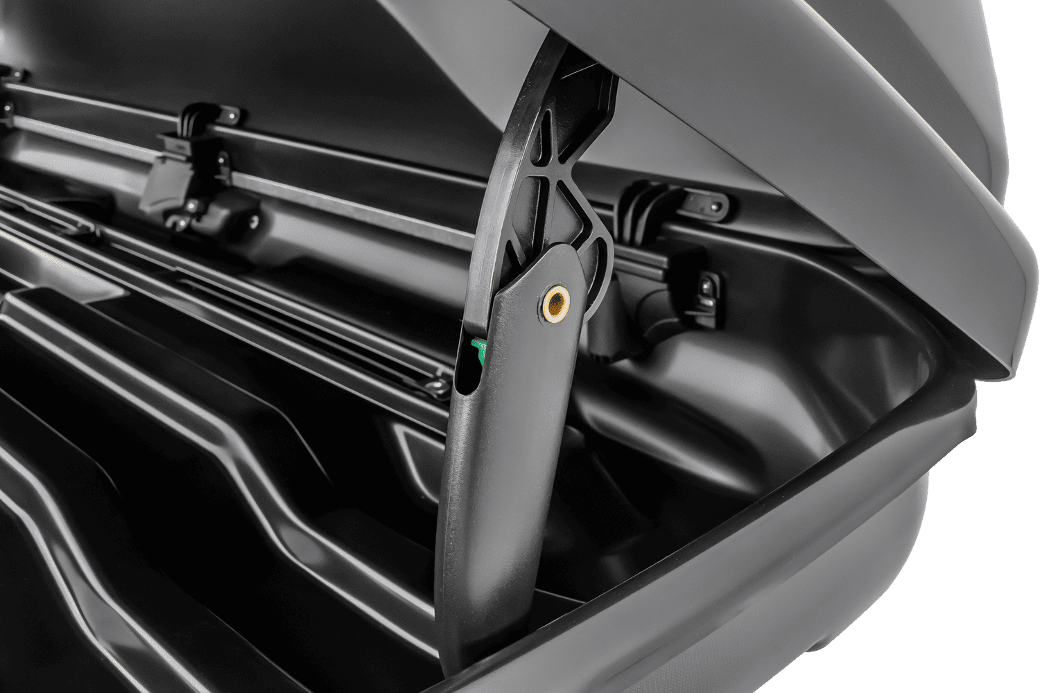 La structure est en plastique ABS de haute qualité, résistant aux UV et aux intempéries, ce qui garantit une grande fiabilité en toutes saisons. La sécurité est assurée par le système Safe Guard, qui empêche toute ouverture accidentelle du couvercle et signale sa bonne fermeture. Un système de verrouillage centralisé à trois points sécurise les bagages, et la clé ne peut être retirée que lorsque le couvercle est correctement fermé.