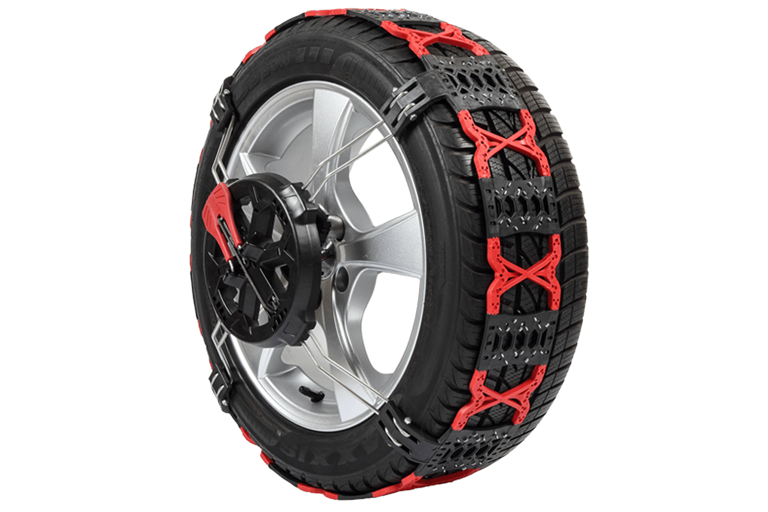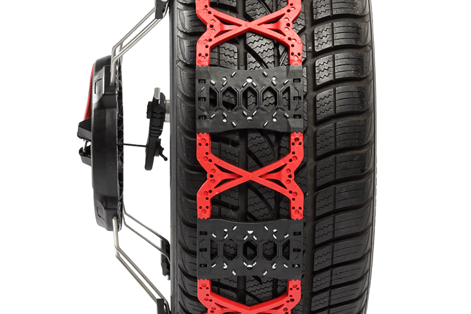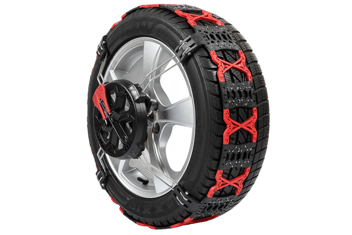 La chaîne, en plastique renforcé, est agencée en nid d'abeille, offrant une excellente traction sur la neige, facilitant les démarrages et garantissant des distances de freinage plus courtes sur la glace. L'épaisseur des maillons de la chaîne sur la bande de roulement est de seulement 7 mm.