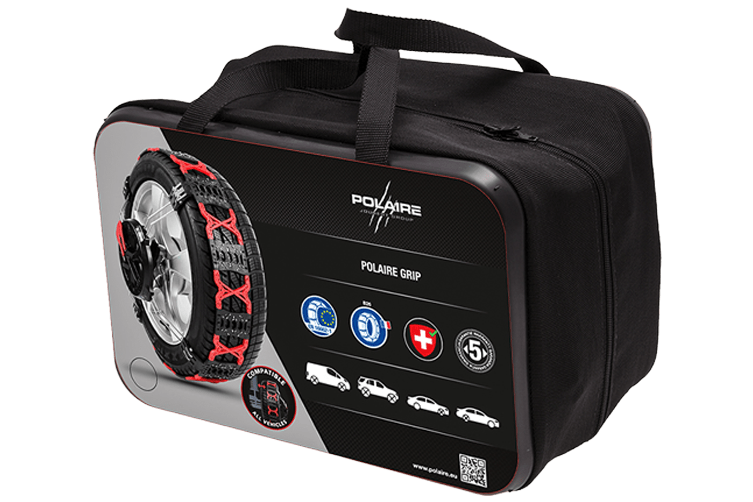 Elles sont idéales pour la plupart des voitures particulières et des SUV, ainsi que pour les fourgonnettes jusqu'à 3500 kg, même celles dont l'espace entre le pneu et la suspension est réduit, empêchant ainsi l'utilisation de chaînes à neige traditionnelles. La conception des chaînes à neige Polare Grip garantit qu'aucune partie de la chaîne ne chevauche les flancs intérieurs des pneus, réduisant considérablement le risque de collision avec les éléments de suspension, le système de freinage ou les capteurs ABS, TPMS et ESP.
