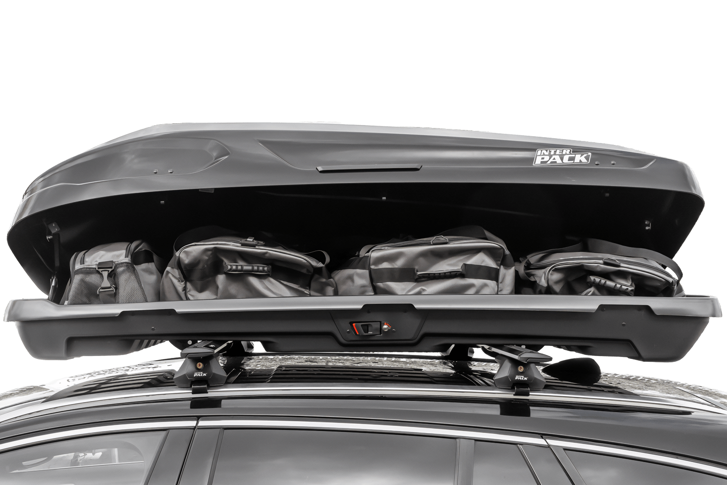 - Box Inter Pack Monsun PRO L, noir métallisé, 550 l. Léger, robuste (charge 75 kg). Systèmes Smart Lock, Rapid Fit garantissent une installation rapide et sécurisée, tandis que l'ouverture bidirectionnelle permet un accès à vos bagages. Sangles incluses.