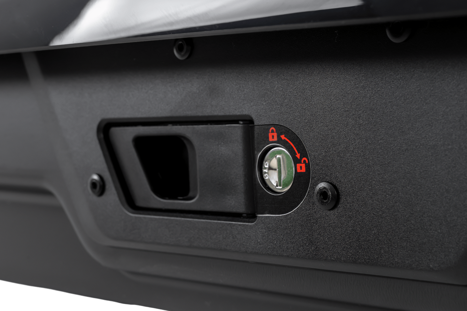Le système d'ouverture bidirectionnelle facilite l'accès aux bagages des deux côtés du véhicule, et le verrouillage centralisé trois points assure une sécurité totale de vos biens. La clé ne peut être retirée que lorsque le hayon est correctement fermé. Le mécanisme Smart Lock indique la bonne fermeture et les loquets automatiques empêchent toute ouverture accidentelle.