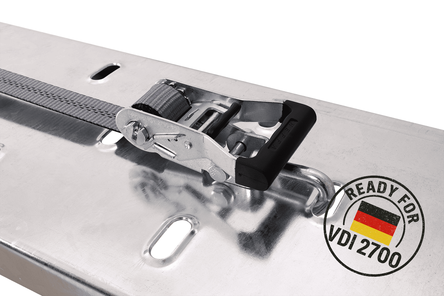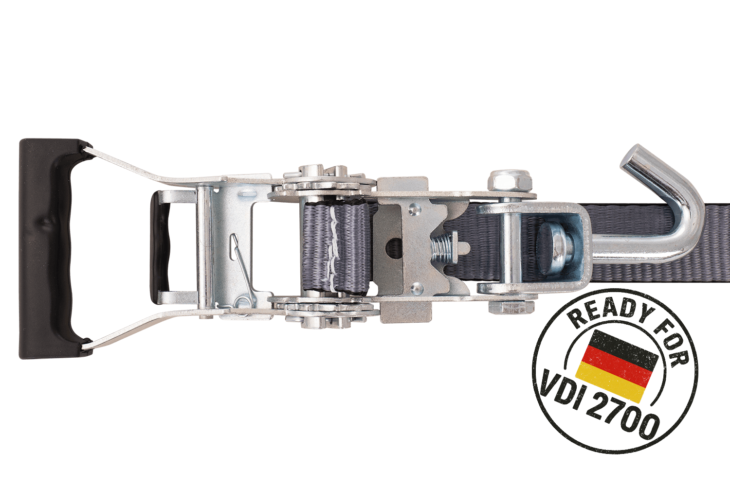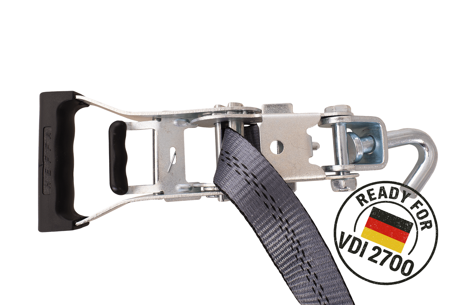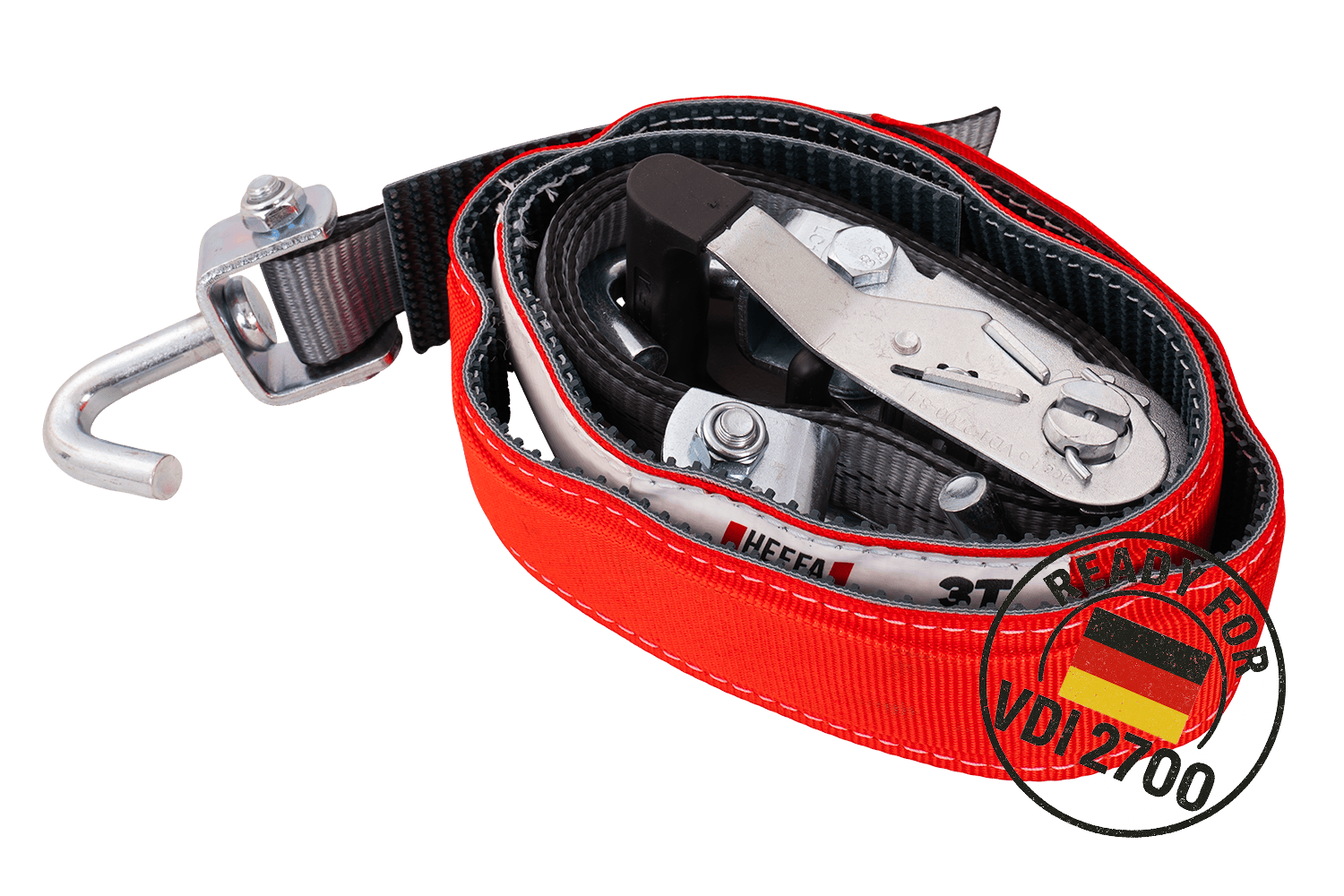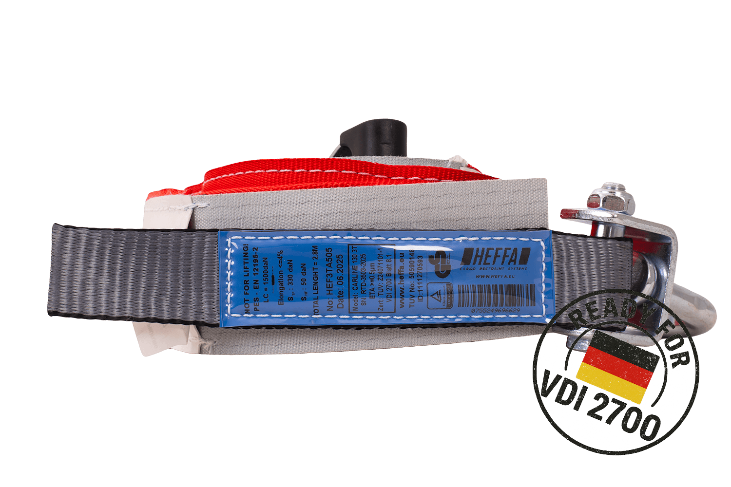 Il s'agit d'une norme européenne spécifiant les exigences relatives aux sangles d'arrimage à tendeur manuel utilisées pour l'arrimage des charges lors du transport routier. La norme EN 12195-2 définit, entre autres, les valeurs des forces de tension (SHF), de la force d'arrimage (LC), de la résistance des sangles, les essais dynamiques et la méthode de marquage du produit. Les sangles certifiées conformes à cette norme répondent à toutes les exigences de sécurité européennes et peuvent être utilisées légalement dans toute l'UE.