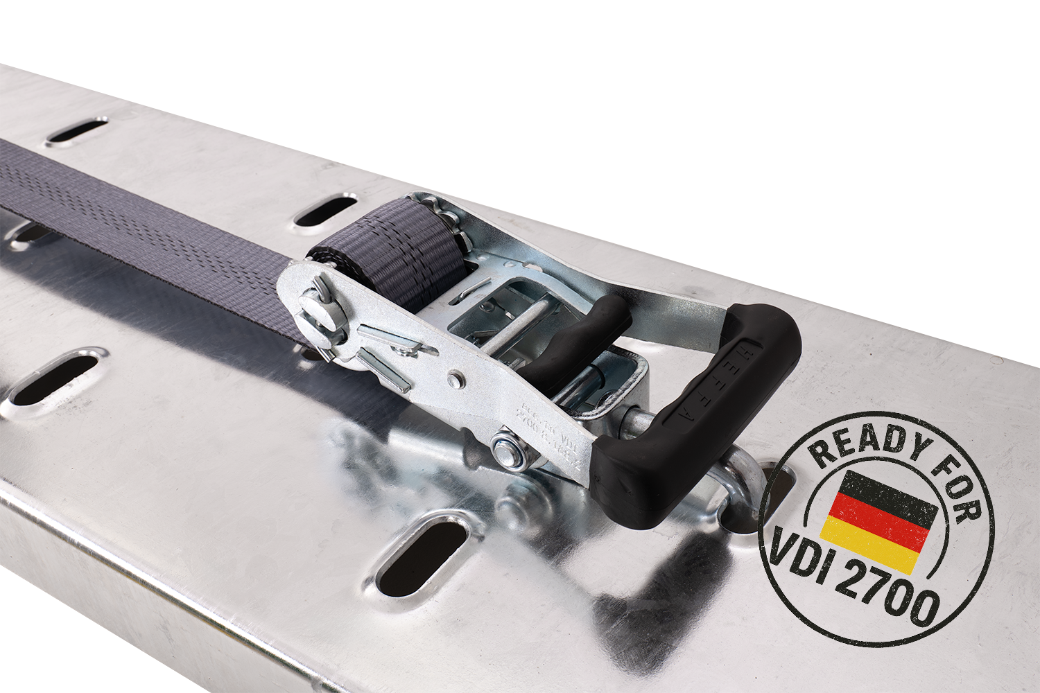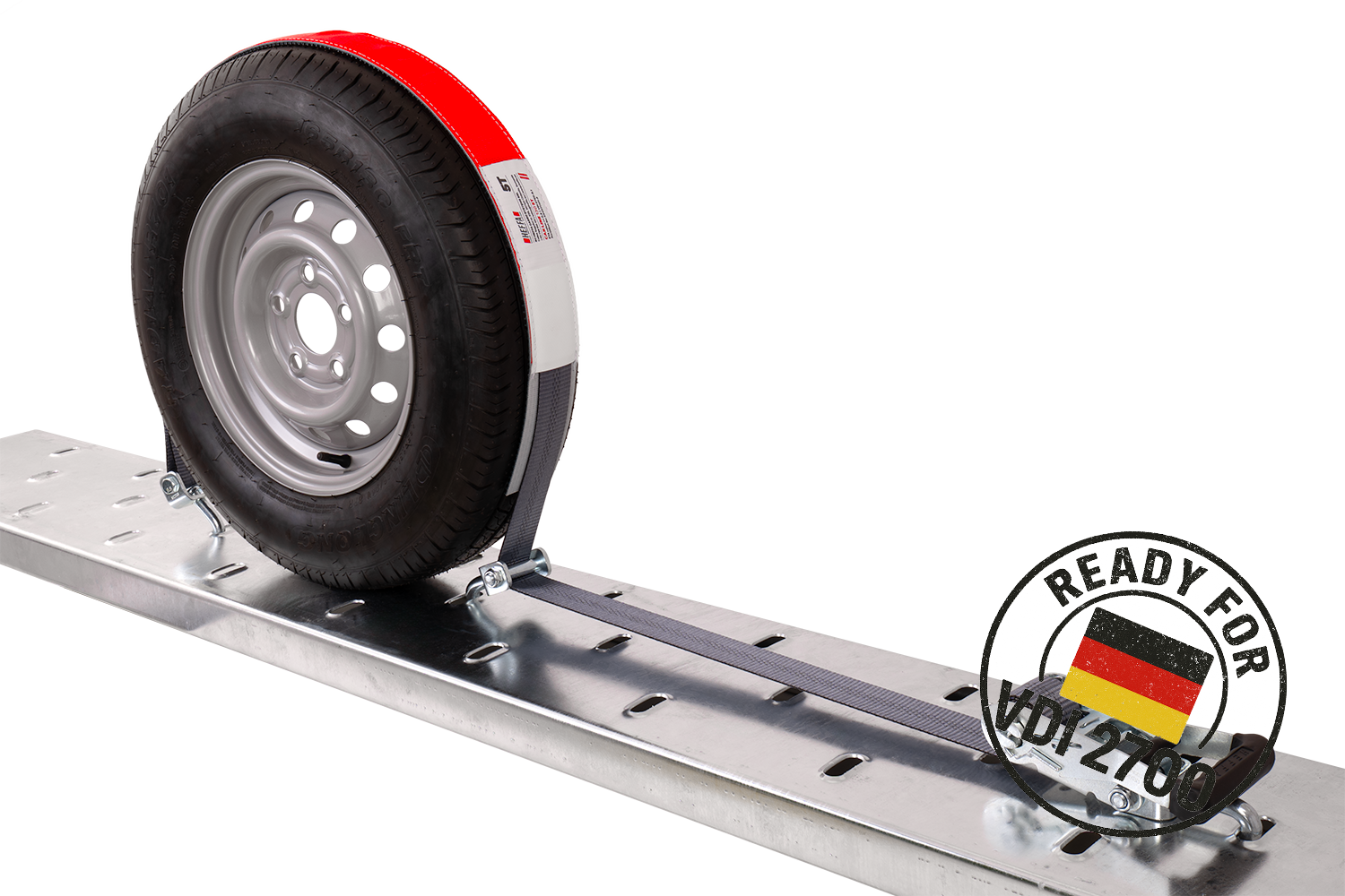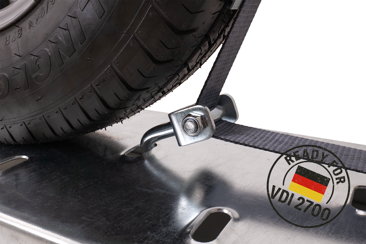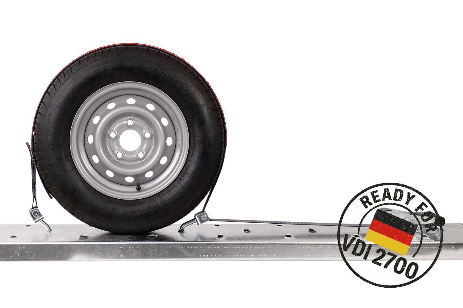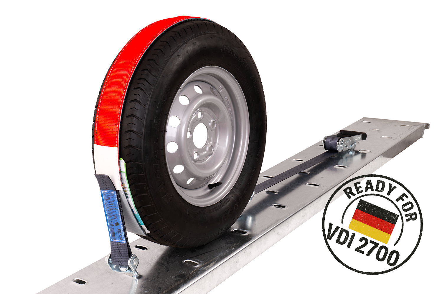 La directive VDI 2700 partie 8.1 est une norme technique allemande qui spécifie les exigences détaillées pour l'arrimage des véhicules transportés sur des remorques à plateau et des remorques. Concernant les sangles d'arrimage, notamment pour le cerclage des roues, cette directive précise, entre autres, le mode de disposition des sangles, le nombre de points d'arrimage requis (par exemple, système à 3 points), les paramètres de force de tension minimale et les principes de leur marquage et de leurs homologations techniques. La conformité à la norme VDI 2700 8.1 garantit que les sangles répondent à des exigences strictes en matière de sécurité, de fiabilité et d'efficacité d'immobilisation du véhicule transporté, un critère crucial pour le transport professionnel de voitures particulières et de camionnettes. L'utilisateur est ainsi assuré que le système d'arrimage utilisé est conforme aux normes européennes et allemandes en vigueur en matière de sécurité routière.
