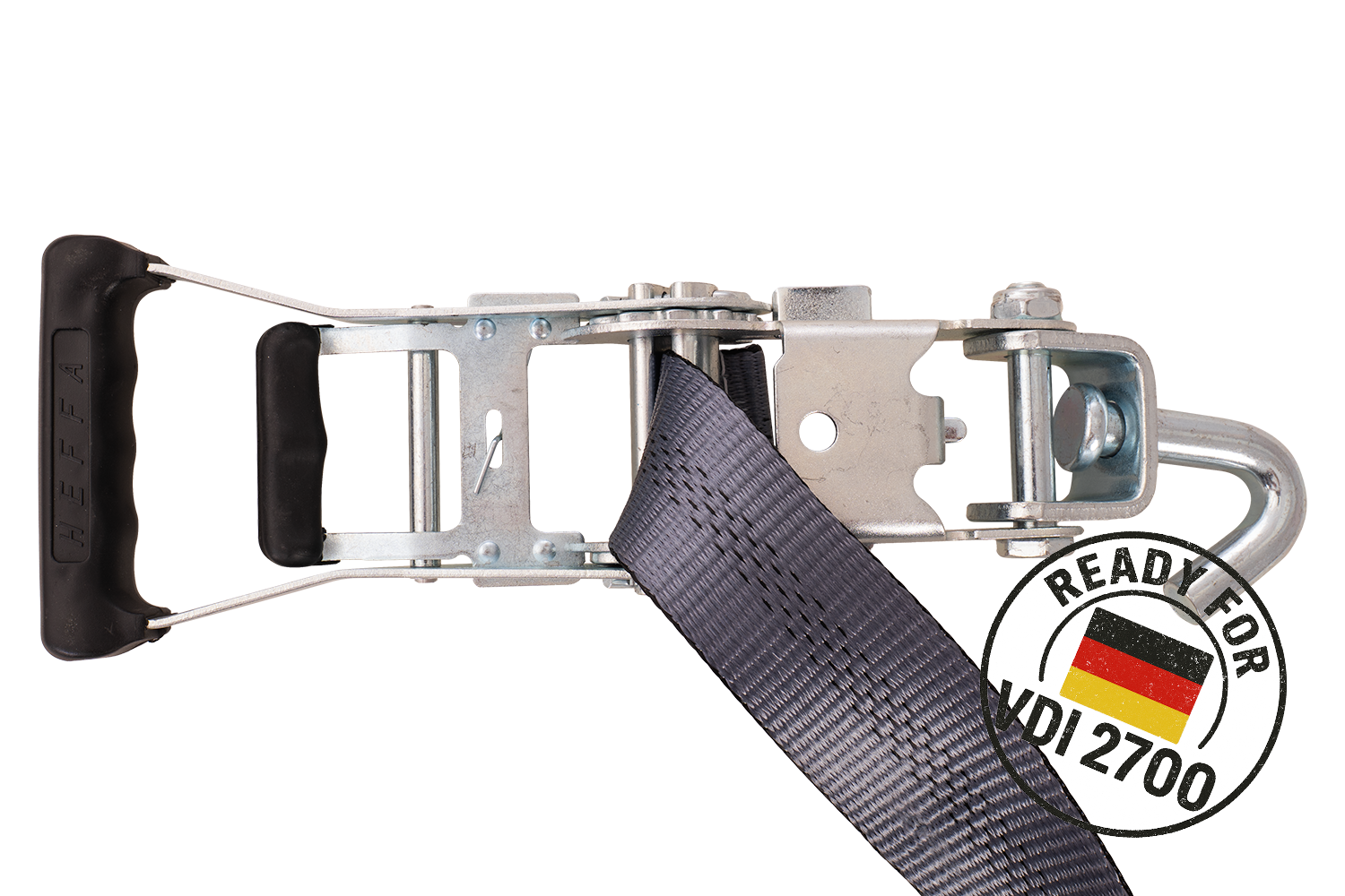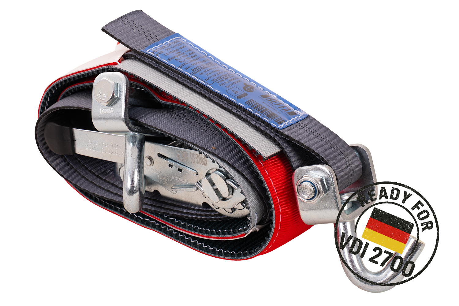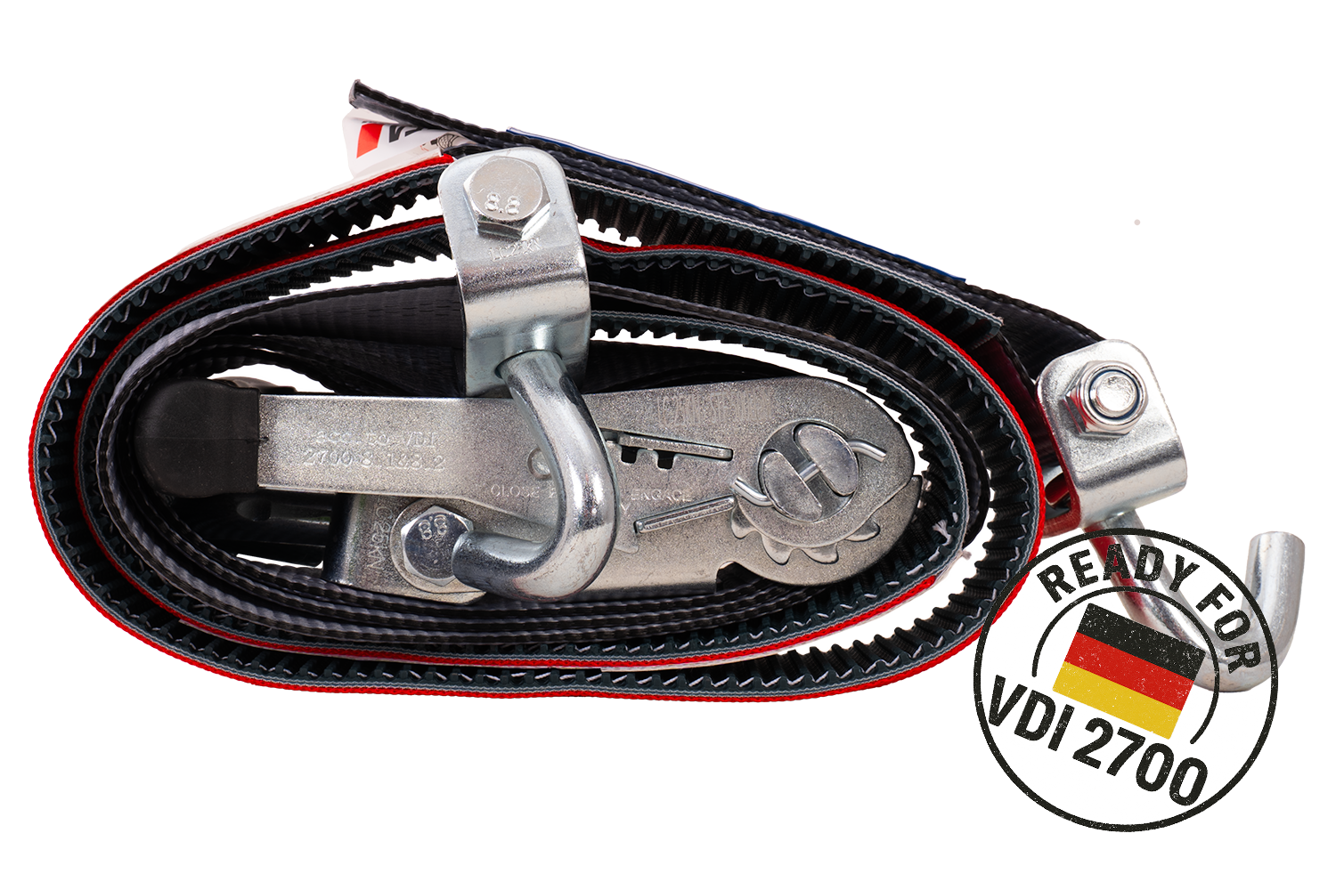 Il s'agit d'une norme européenne spécifiant les exigences relatives aux sangles d'arrimage à tendeur manuel utilisées pour l'arrimage des charges lors du transport routier. La norme EN 12195-2 définit, entre autres, les valeurs des forces de tension (SHF), de la force d'arrimage (LC), de la résistance des sangles, les essais dynamiques et la méthode de marquage du produit. Les sangles certifiées conformes à cette norme répondent à toutes les exigences de sécurité européennes et peuvent être utilisées légalement dans toute l'UE.