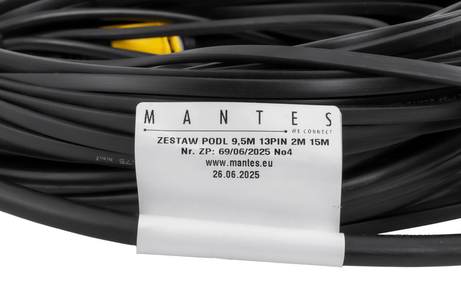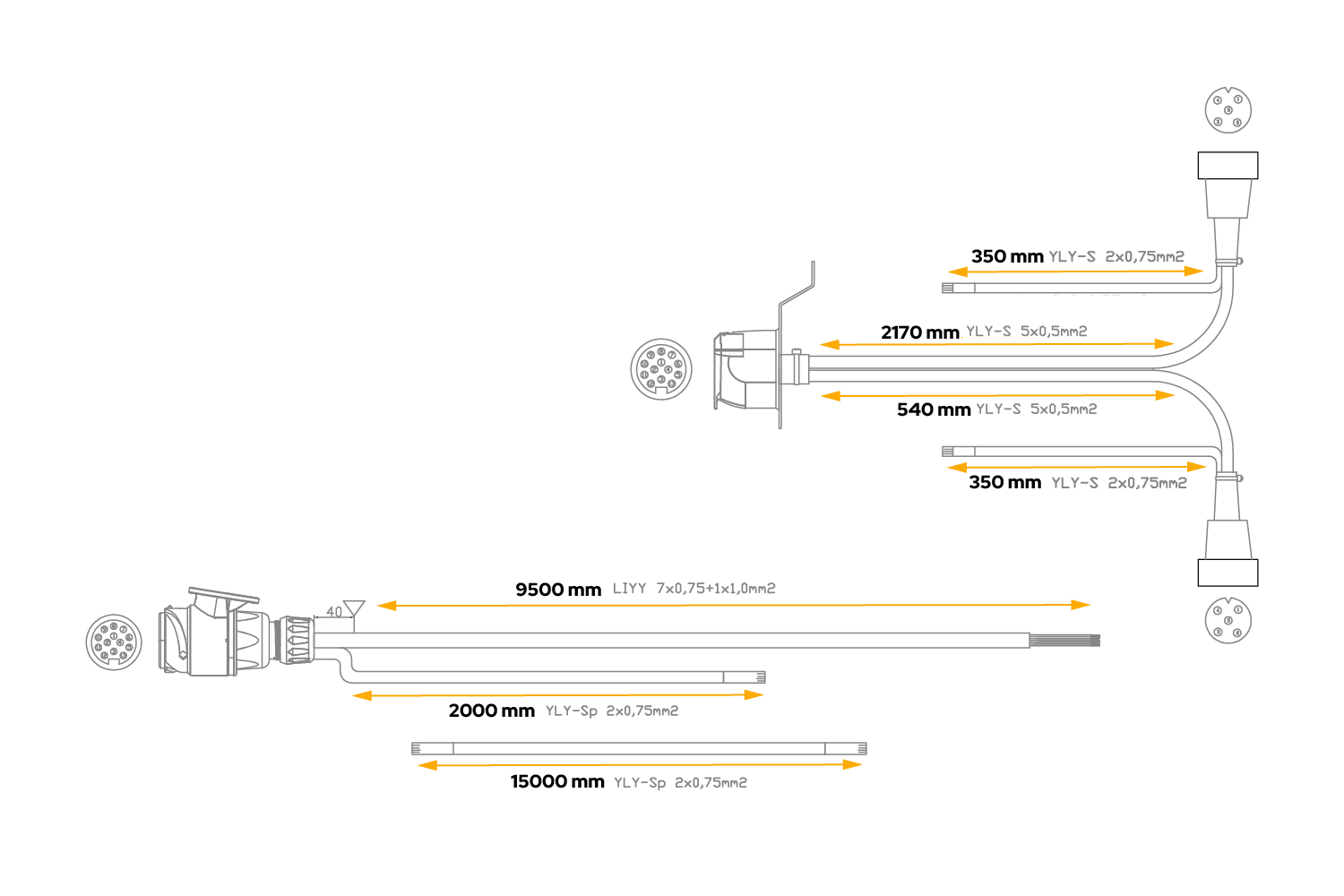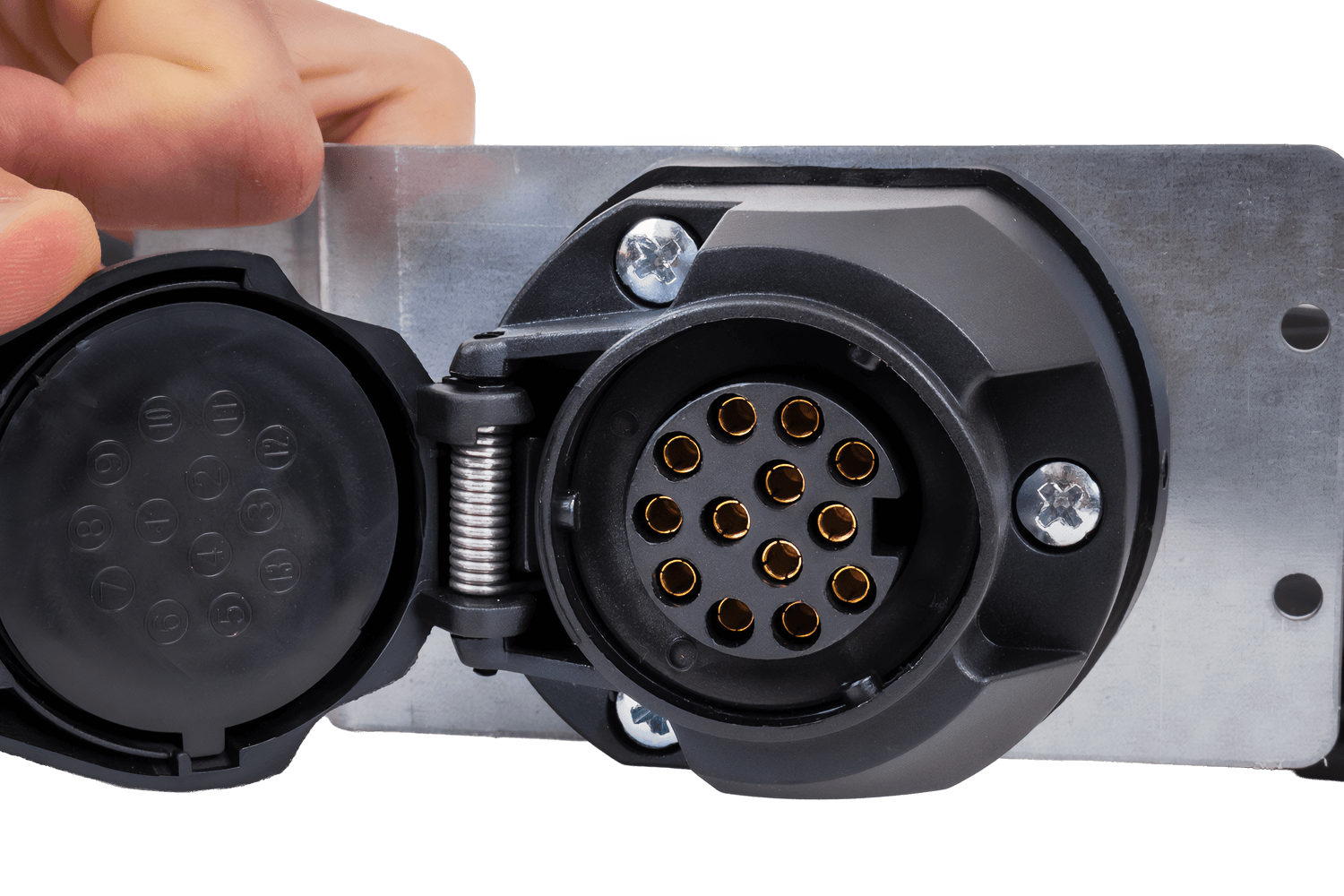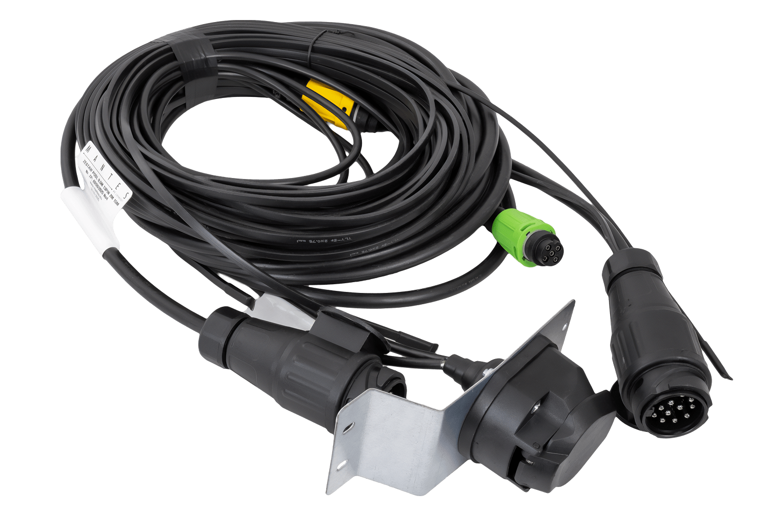 Le premier élément est le faisceau principal avec une prise 13 broches de 9,5 mètres de long et un câble de feux de gabarit de 2 mètres, permettant de connecter le système électrique du véhicule tracteur à la poutre arrière de la remorque. Le kit comprend également une prise 13 broches à monter soi-même sur la poutre, permettant une connexion et une déconnexion rapides de l'ensemble du faisceau lumineux.