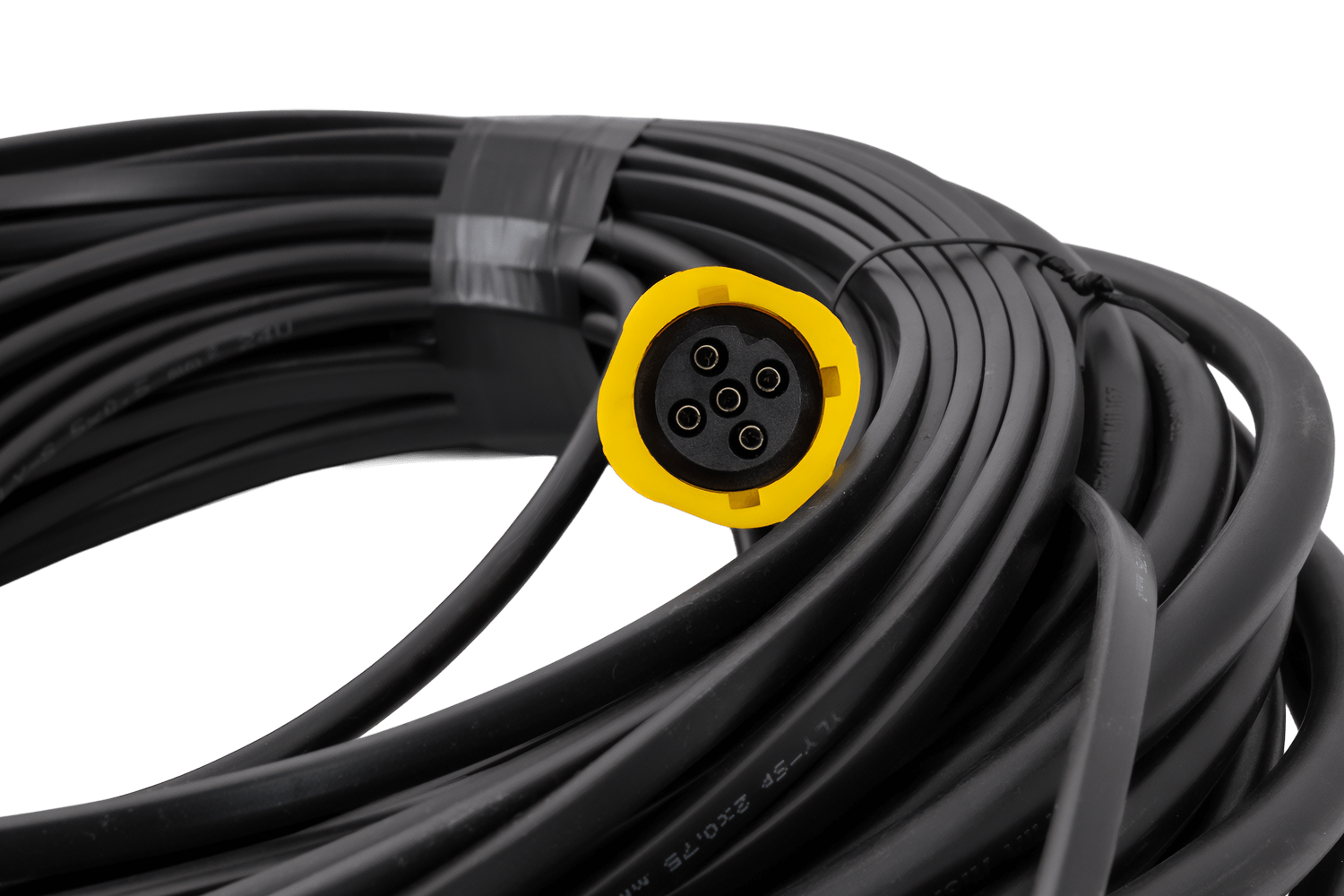 La deuxième partie comprend un connecteur pour la rampe de feux arrière (par exemple, retiré pour la mise à l'eau d'un bateau). Le câble, long de 2,17 mètres, est doté de connecteurs à baïonnette à 5 broches pour le raccordement des feux arrière. Son indice d'étanchéité IP67 élevé offre une excellente protection contre l'eau, la boue et la poussière, idéale pour une utilisation en conditions humides, comme le transport en bateau ou le tout-terrain. De plus, le câble est doté d'une dérivation intégrée pour deux fils de 0,35 mètre chacun destinés aux feux de gabarit, qui indiquent efficacement les dimensions du véhicule de jour comme de nuit, améliorant ainsi la sécurité lors des manœuvres et de la conduite dans des conditions difficiles.