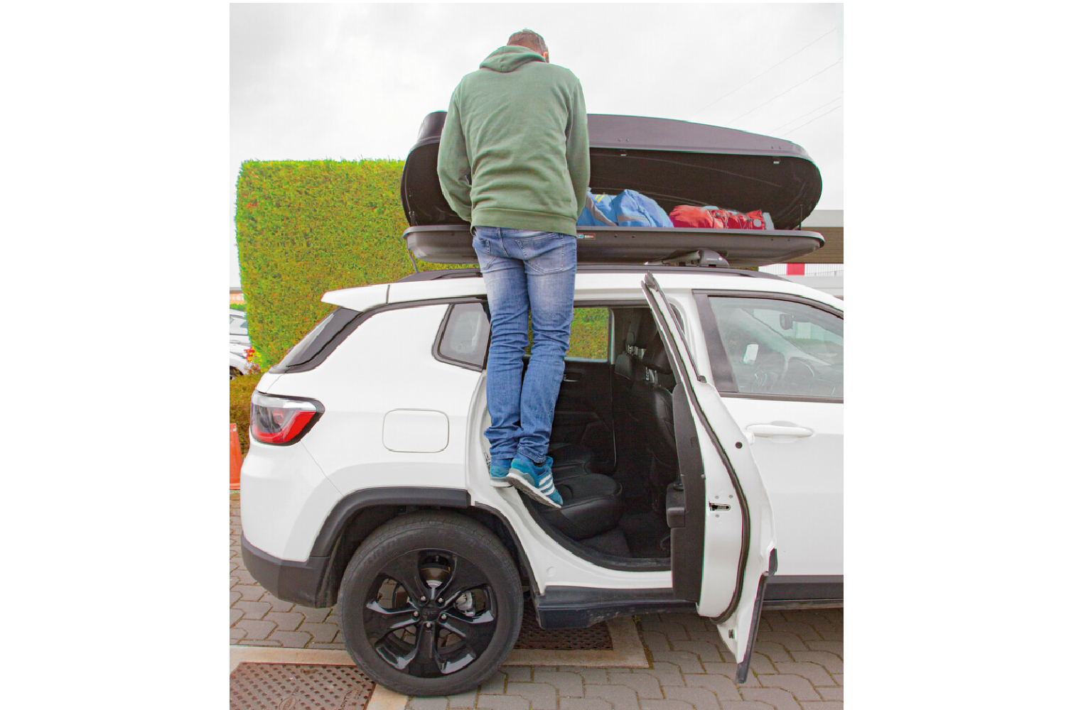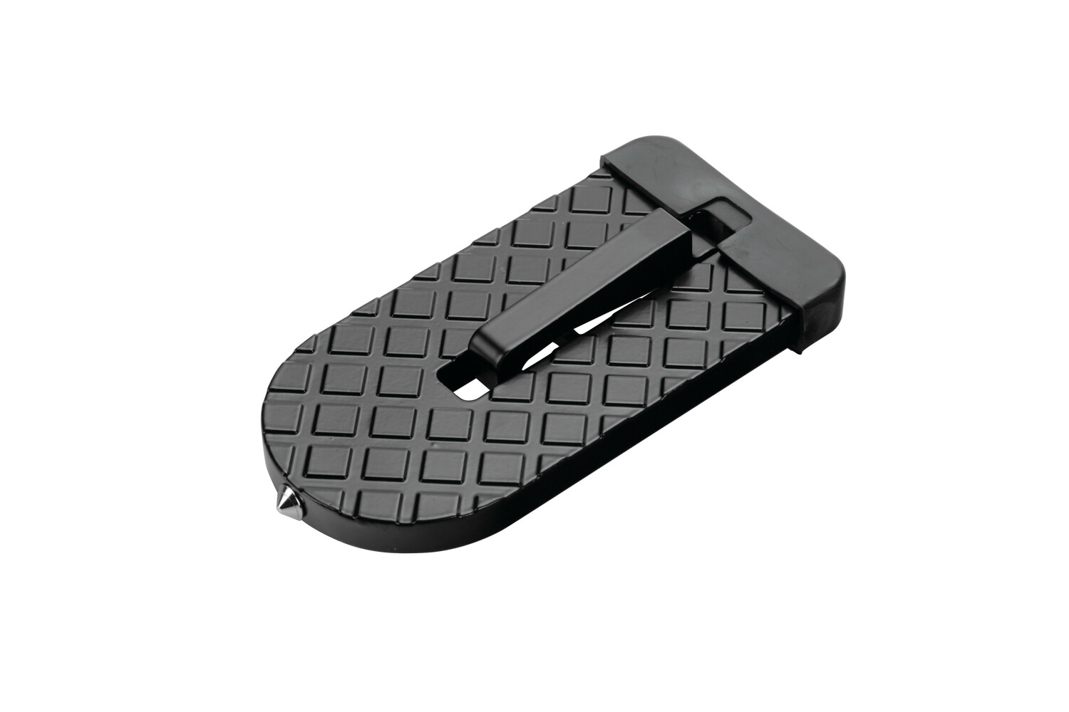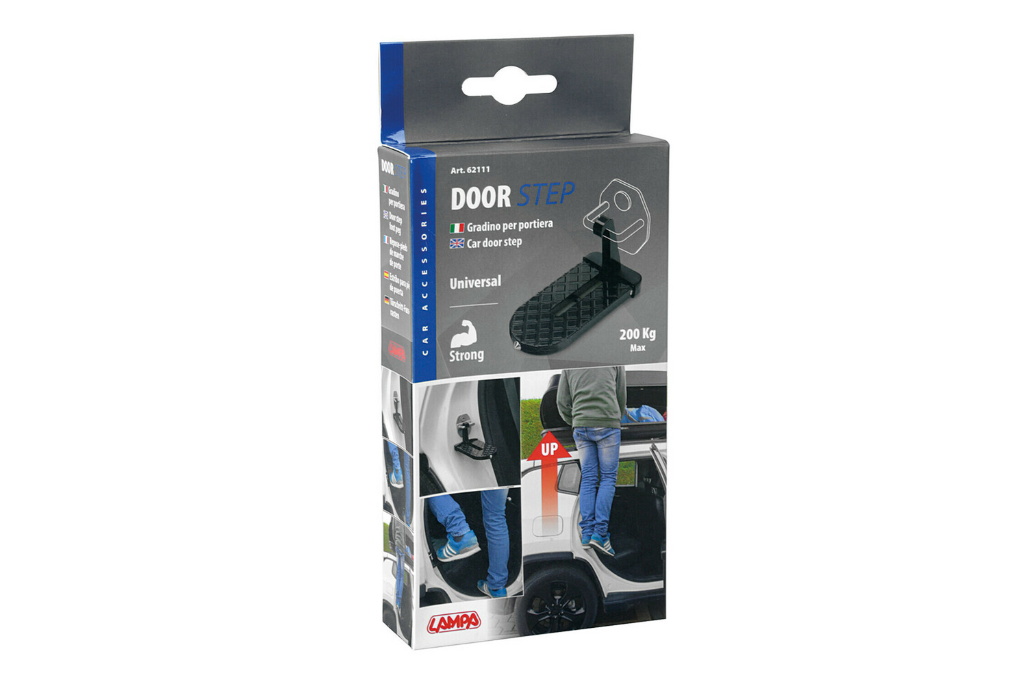 L'installation dans le loquet de verrouillage ne prend que quelques instants et ne nécessite aucun outil. Après utilisation, l'accessoire se range facilement dans la boîte à gants ou le coffre. Le marchepied est en alliage d'aluminium et un revêtement en caoutchouc anti-rayures protège la peinture et les montants de porte.