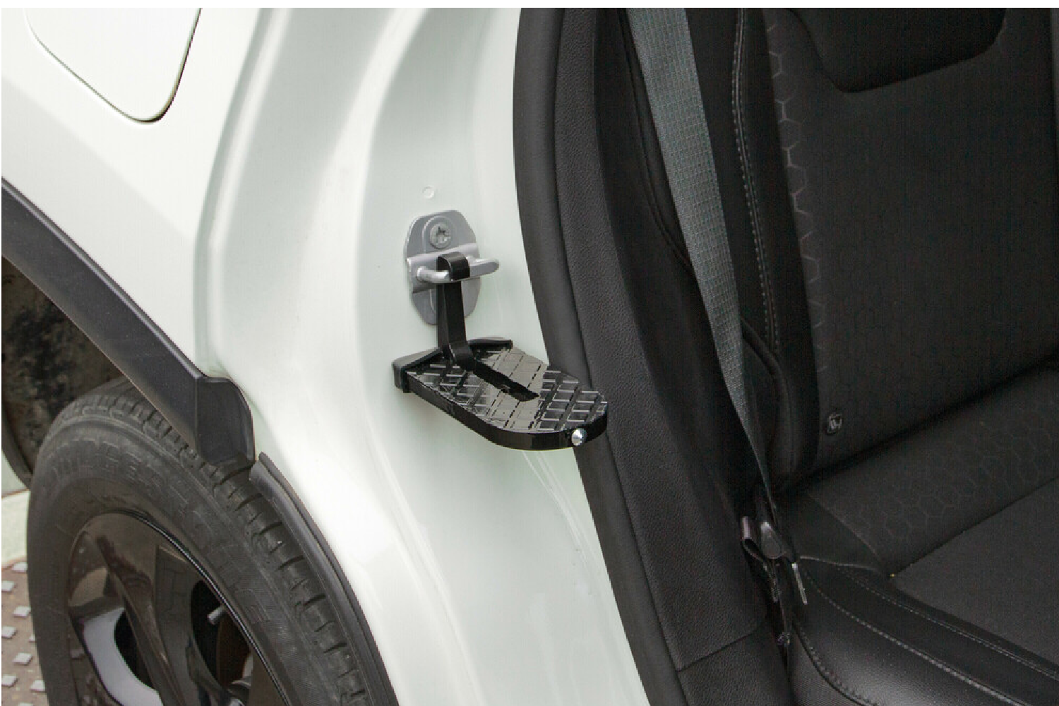 Il suffit d'accrocher le marchepied au loquet de la serrure de la porte, en veillant à ce qu'il soit bien fixé et que l'élément en caoutchouc repose contre la carrosserie ; placez votre pied au centre. Cet accessoire est compatible avec la plupart des voitures.