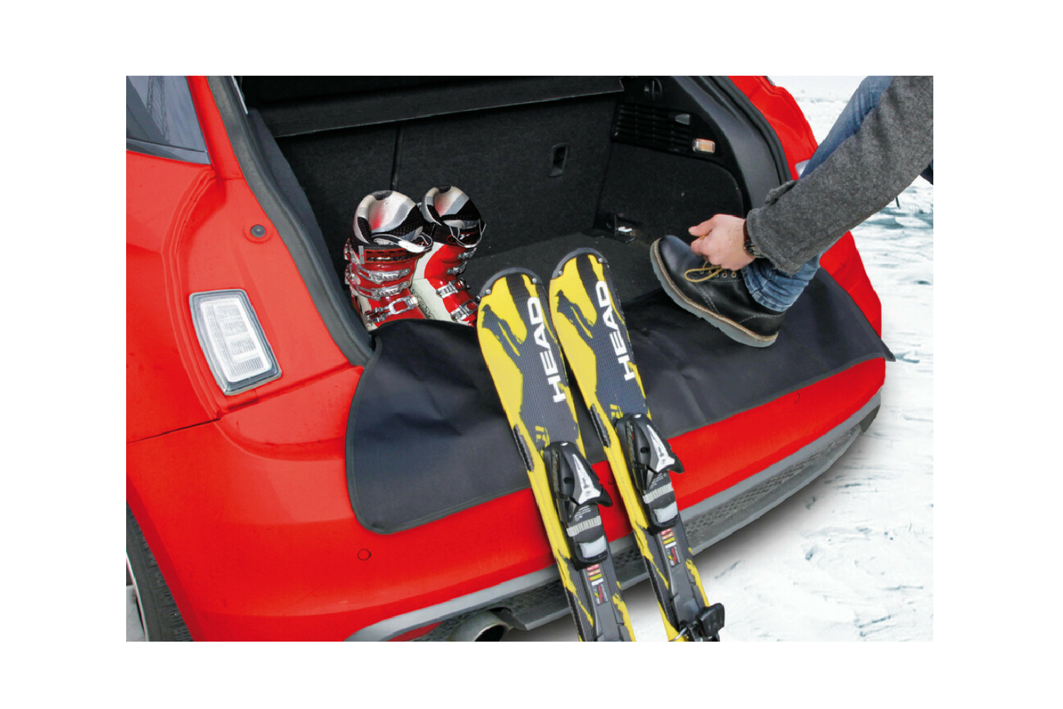 Fabriqué en polyester 600D résistant avec revêtement PU imperméable, il est durable, antitache et facile à nettoyer (une simple éponge et de l'eau suffisent). L'installation est rapide : des crochets et des sangles réglables se fixent aux crochets de coffre d'origine. Pour les véhicules sans crochets, un kit de montage avec vis est inclus. Pour l'utiliser, dépliez simplement le tapis sur le pare-chocs et repliez-le dans le coffre après le chargement.