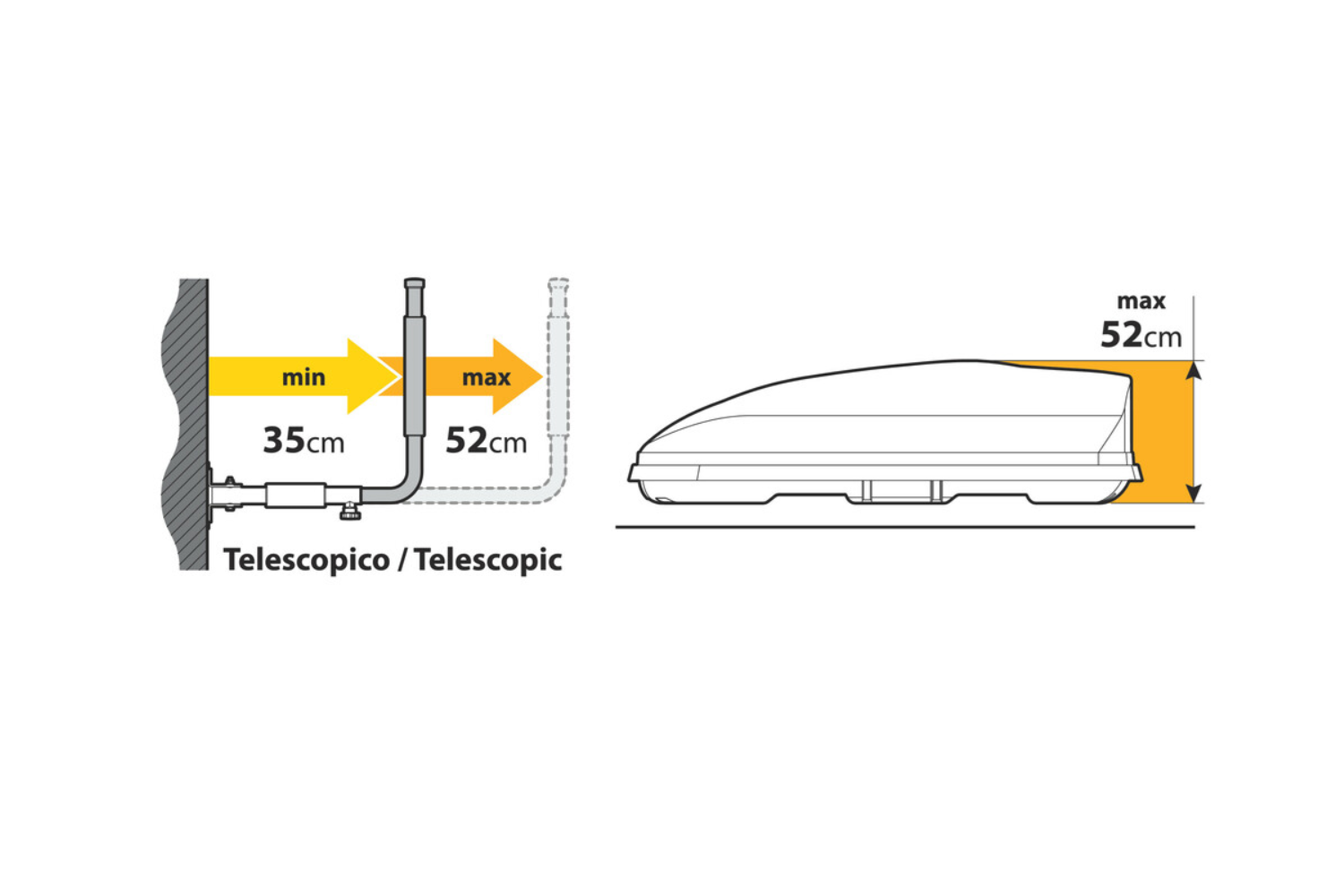 - Supports muraux LAMPA TYPE 1 pour coffre de toit sur le côté. Capacité charge max 40 kg, plage réglage 35 à 52 cm, pour la plupart des modèles. Supports pour l'utilisation dans les garages, sous-sols, entrepôt. Permettant de gagner de la place au sol.