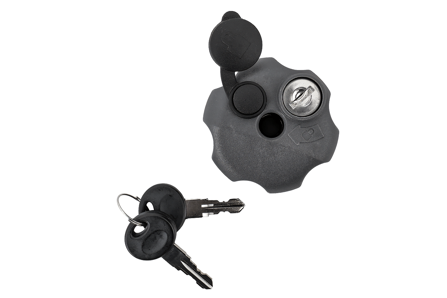 Bouton de sécurité avec clés et une serrure portant le même numéro pour le système de montage conique des plateformes de vélos sur attelage Inter Pack.