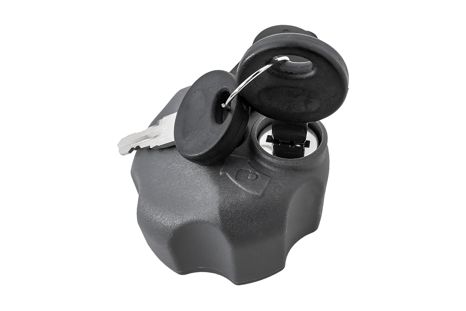 Bouton de sécurité avec clés et une serrure portant le même numéro pour le système de montage conique des plateformes de vélos sur attelage Inter Pack.