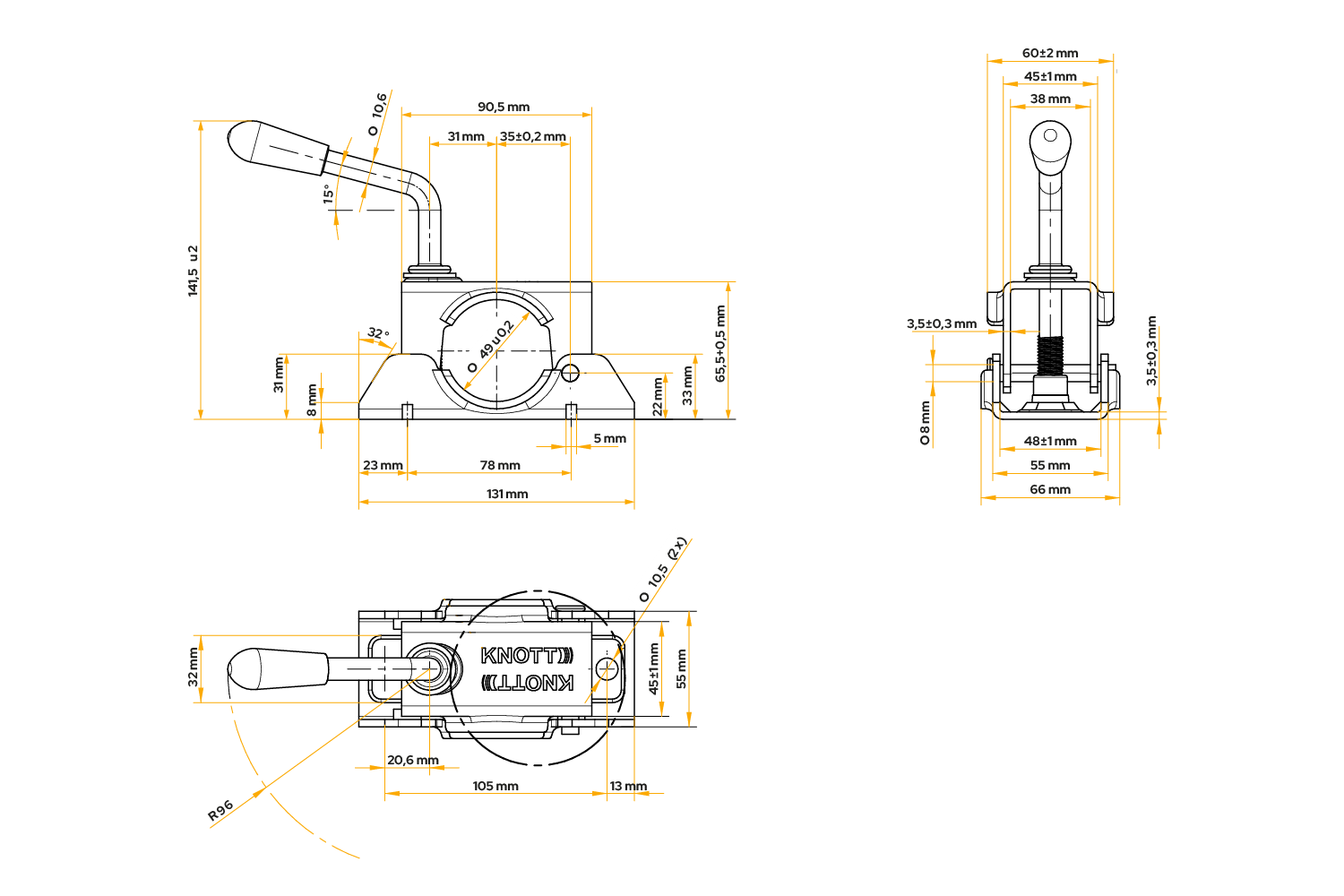La bride de fixation pour roue jockey KNOTT 400305.001 permet de fixer des roues jockey dont le tube a un diamètre de 48 mm. La base en acier est dotée de trous de fixation espacés de 105 mm et d'un diamètre de 11 mm. Permet de fixer rapidement le support au châssis ou au support de timon. Le levier de pression assure une bonne prise sur le tube, réduit les glissements et les vibrations, et permet un réglage rapide de la hauteur de la roue ou son démontage complet pour le transport ou l'entretien.