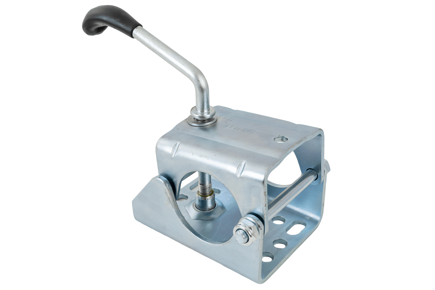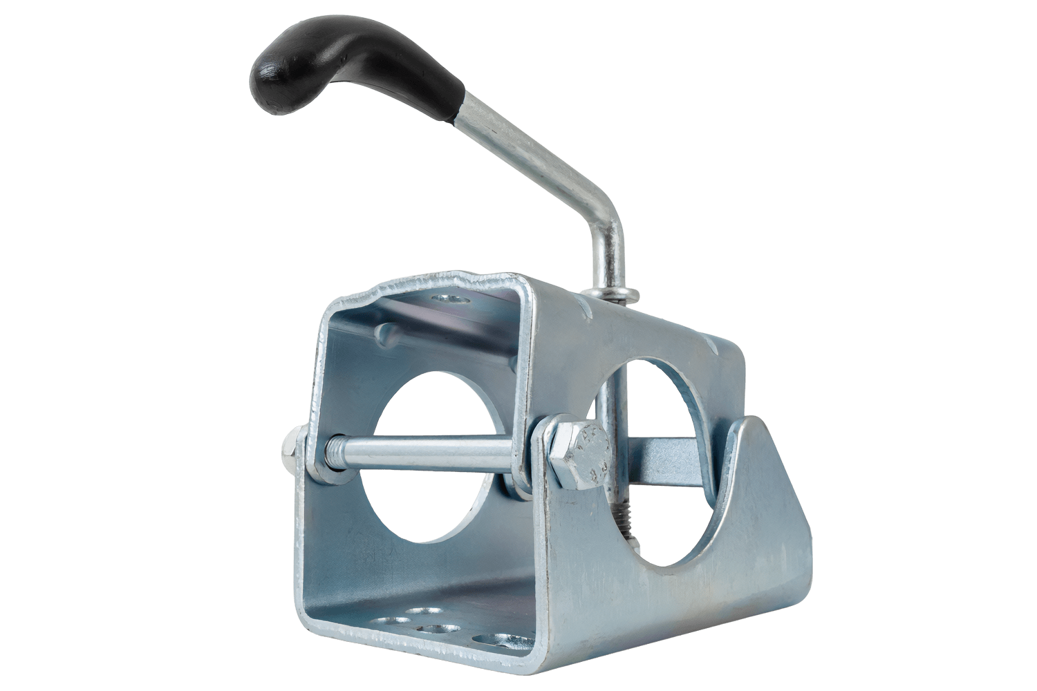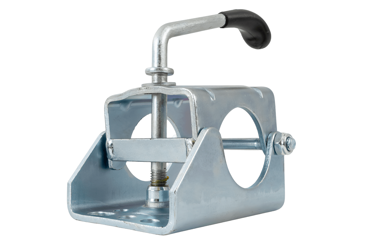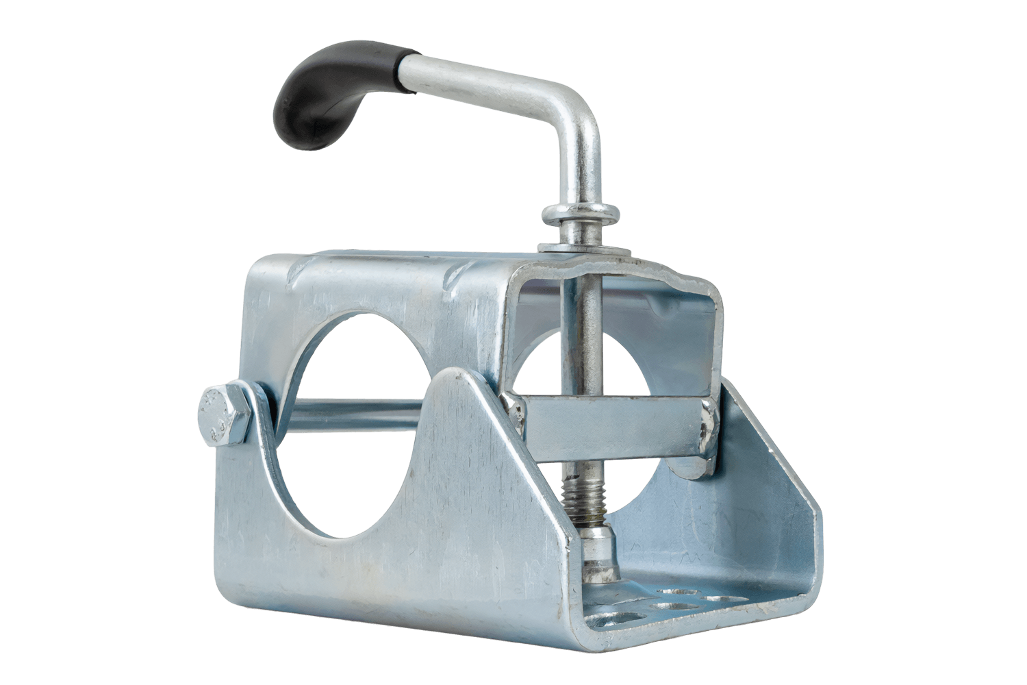 Une roue jockey avec collier permet de soutenir et de manœuvrer facilement le timon de la remorque à l'extérieur du véhicule. Elle facilite l'attelage/dételage, la mise à niveau et le réglage manuel sans risque de chute de la remorque ni d'endommagement de l'attelage. La bride fixe la roue jockey au châssis/support, permettant ainsi des réglages rapides de la hauteur et de la position, voire un démontage complet. Cette solution est idéale pour les remorques cargo, les remorques porte-bateaux et les caravanes.