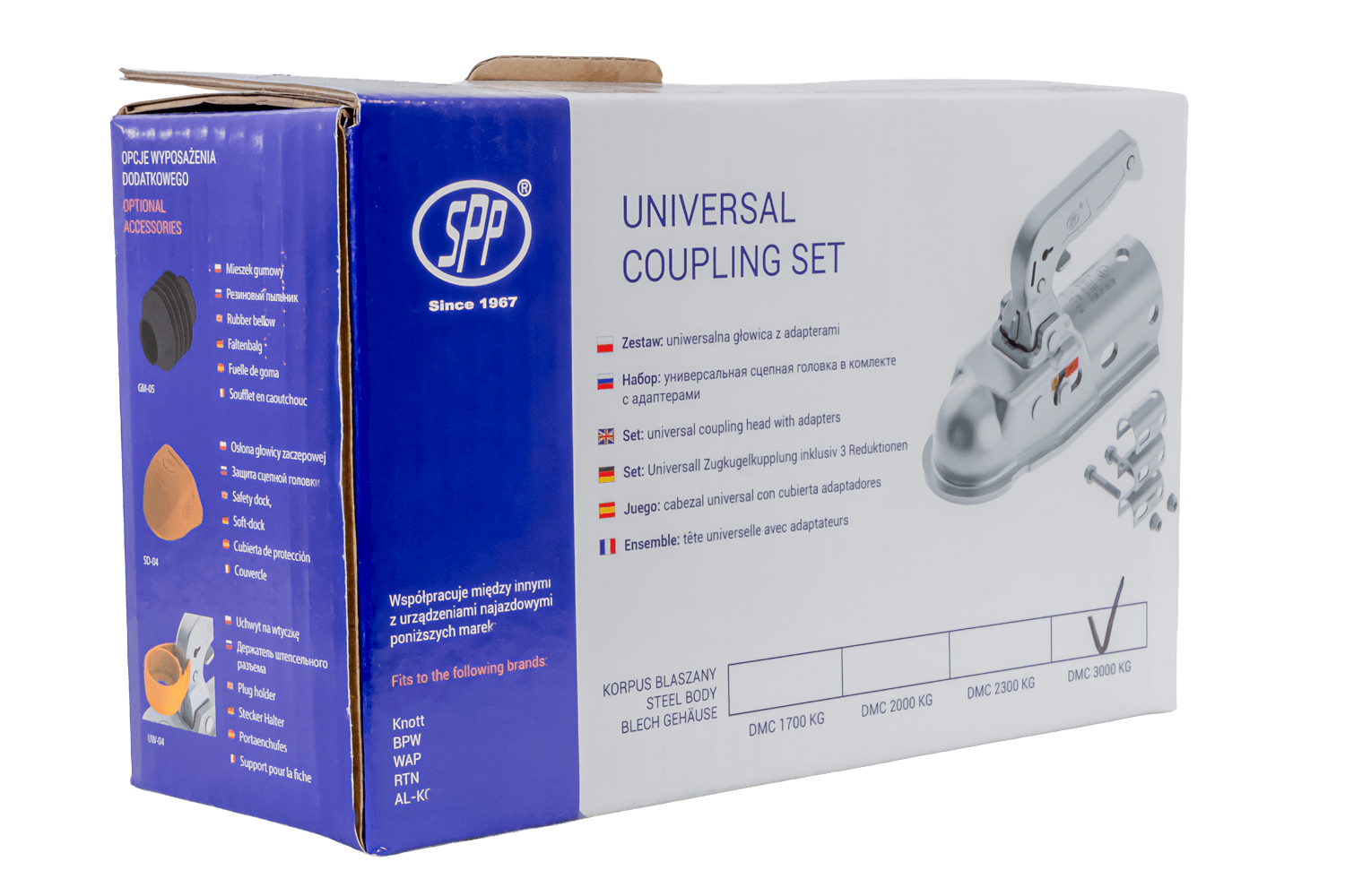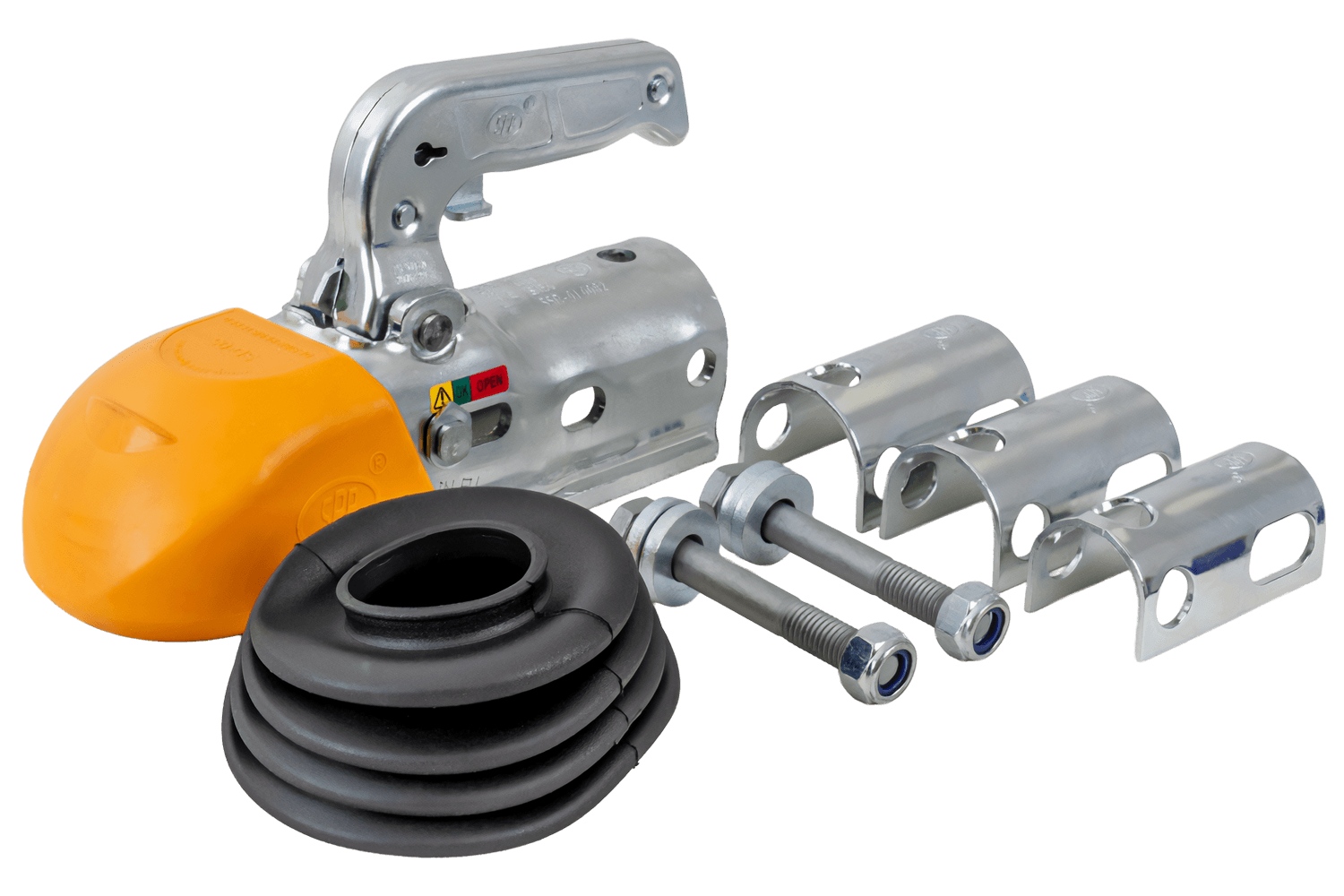 Le kit comprend : une tête d'attelage, des adaptateurs de réduction, des vis de montage, un Safety Dock et un cache en caoutchouc pour dispositif à inertie. Le Safety Dock protège l'arrière du véhicule des rayures et les jambes de l'utilisateur des chocs lors des manœuvres , tandis que le cache en caoutchouc recouvre le tube coulissant, protégeant ainsi le mécanisme à inertie de la saleté et de l'humidité. Grâce aux adaptateurs, la tête d'attelage est compatible avec les dispositifs à inertie dont le diamètre du tube coulissant est compris entre 35 et 50 mm .