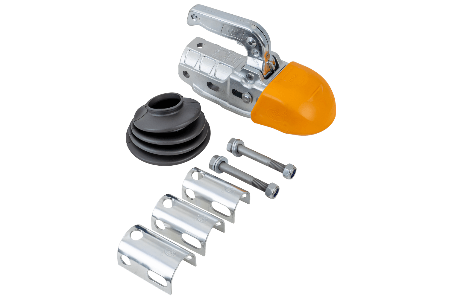 L'ensemble comprend : une tête d'accouplement, des adaptateurs de réduction, des vis de montage, un Safety Dock et un couvercle en caoutchouc pour le dispositif de dépassement. Le Safety Dock protège l'arrière du véhicule des rayures et les jambes de l'utilisateur des chocs lors des manœuvres . Un soufflet en caoutchouc recouvre le tube coulissant, protégeant ainsi le mécanisme de freinage de la saleté et de l'humidité. Des adaptateurs rendent la tête d'attelage compatible avec les dispositifs de freinage dont le diamètre du tube coulissant est compris entre 35 et 50 mm.