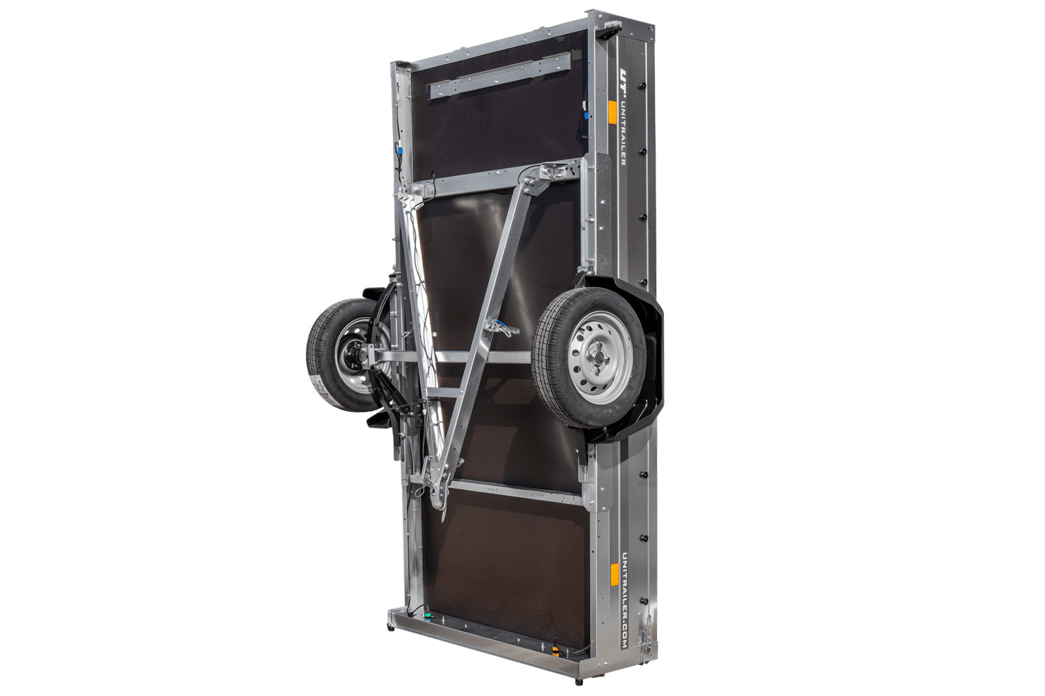 Gain de place. Le timon inclinable est pratique pour le déchargement, mais permet également de ranger la remorque à la verticale.
