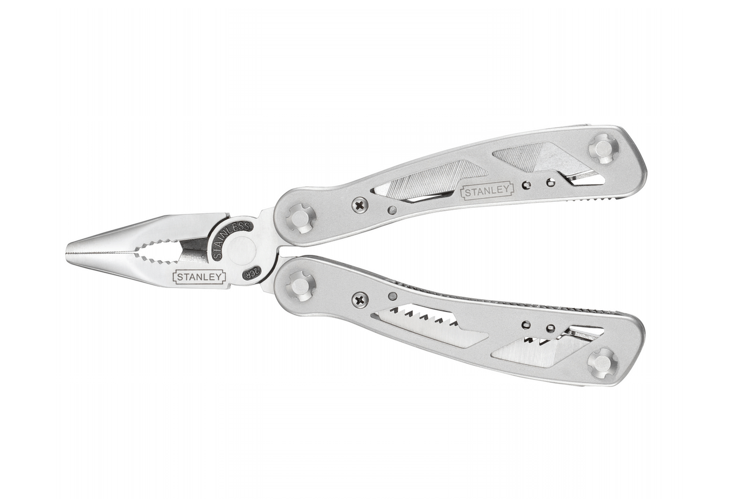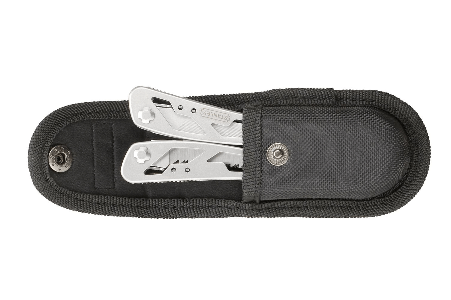 L'outil comprend, entre autres, une pince universelle à mâchoires dentelées et arrondies et un coupe-fil, deux couteaux (grand et petit), une lame de scie, un décapsuleur, une lime et un jeu de tournevis plats (3, 4, 8 mm) et un Phillips PH1.