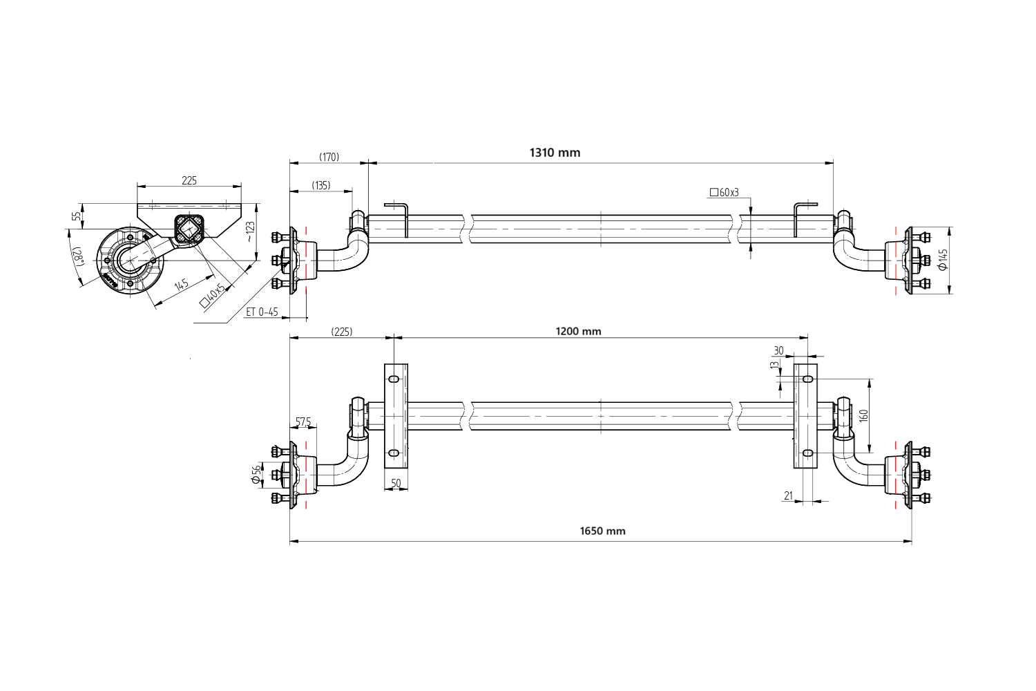 L'essieu non freiné KNOTT 6A8709.001 est conçu pour les remorques légères d' une capacité de charge maximale de 750 kg . L'entraxe de fixation est de 1 200 mm et l'entraxe du moyeu de 1 650 mm , ce qui facilite son installation sur une large gamme de véhicules. L' entraxe standard 4x100 assure la compatibilité avec la plupart des roues disponibles sur le marché. La longueur du bras oscillant est de 145 mm , garantissant stabilité et absorption optimale des chocs, et améliorant ainsi la sécurité de conduite, même à pleine charge.