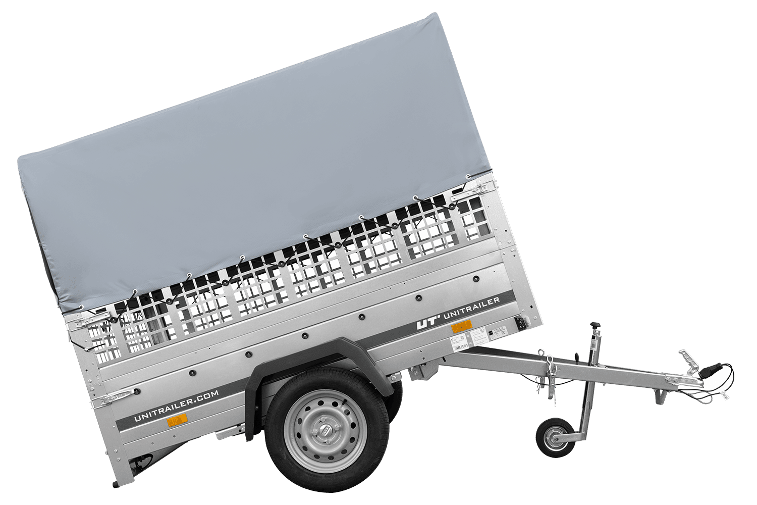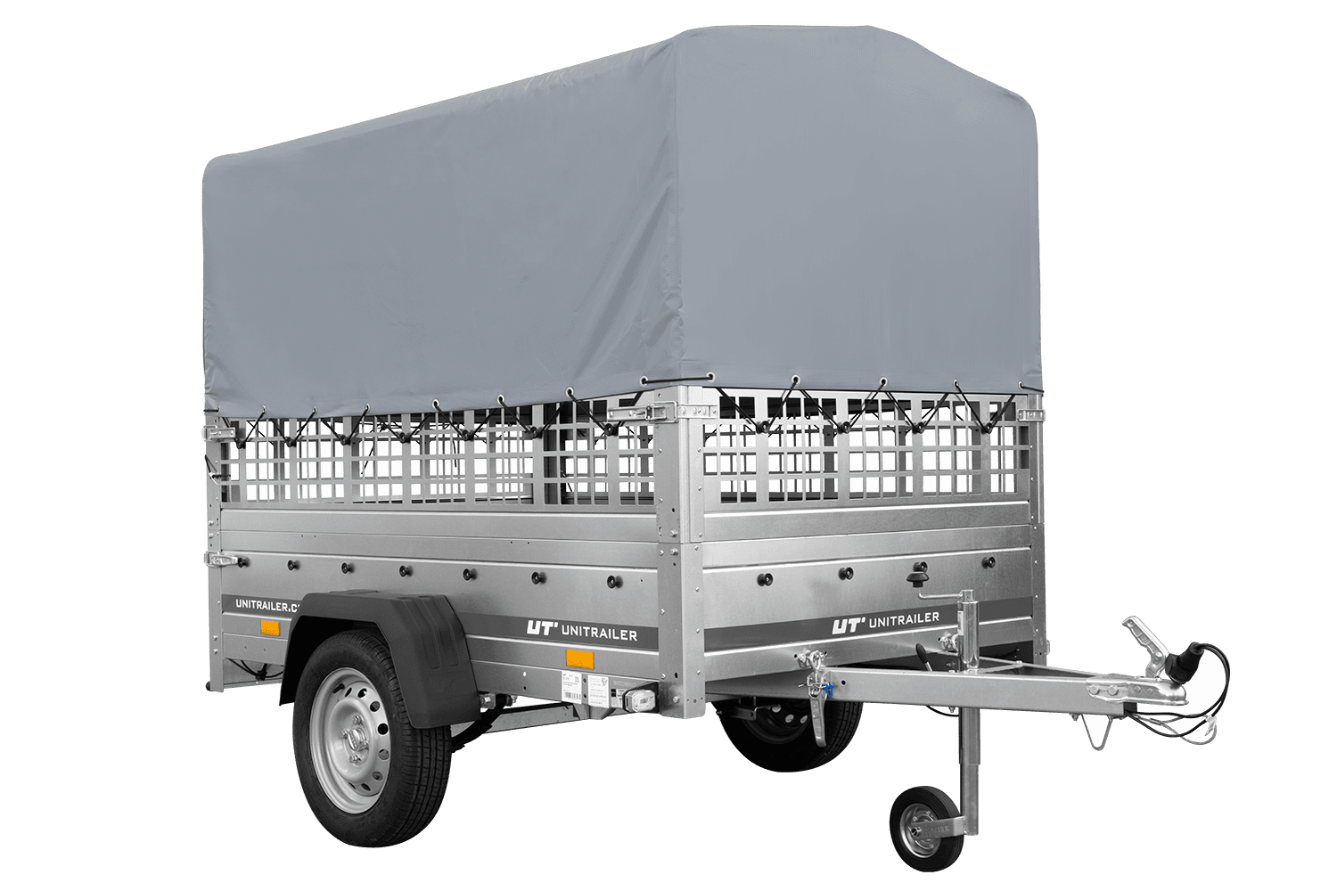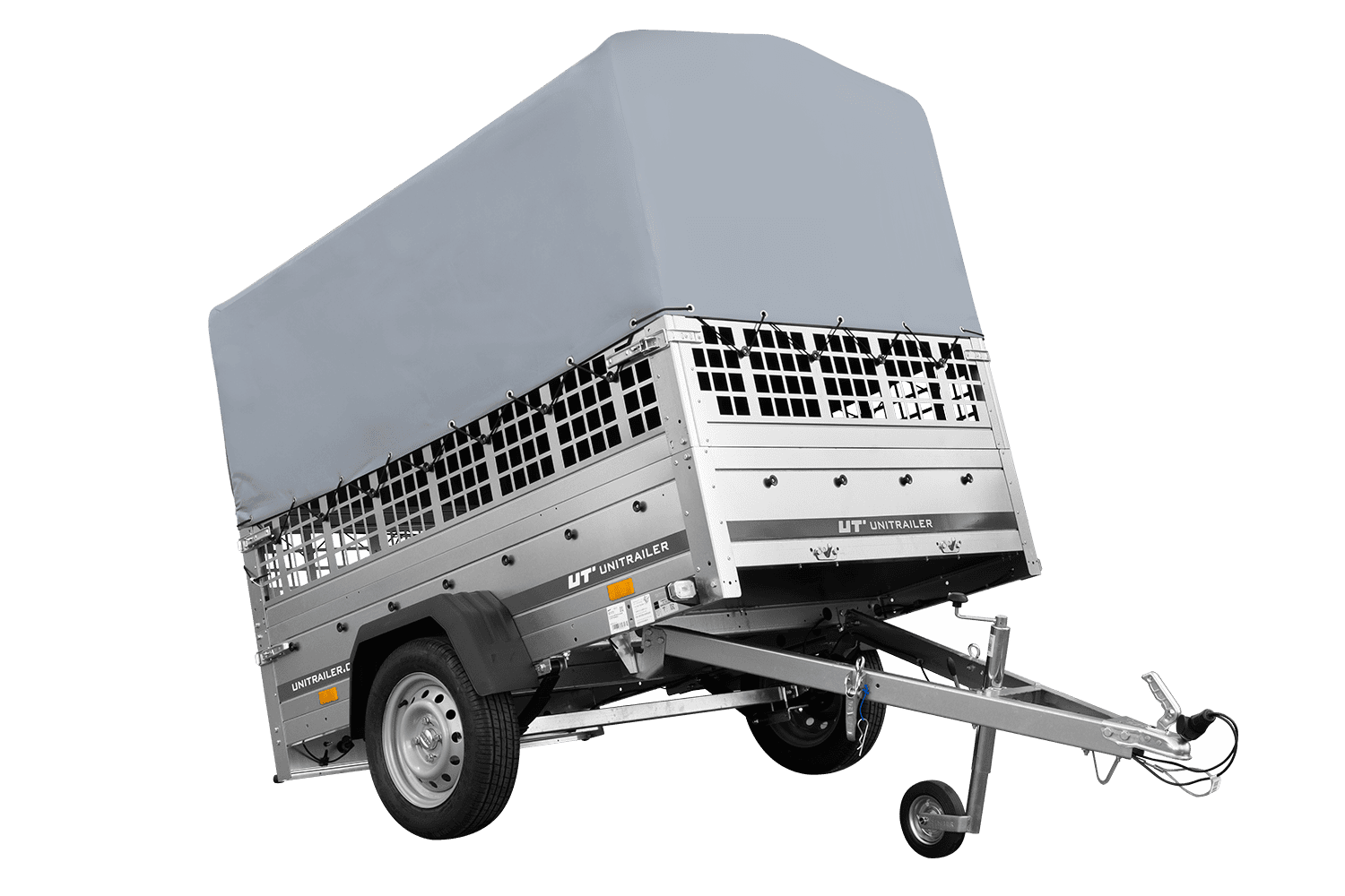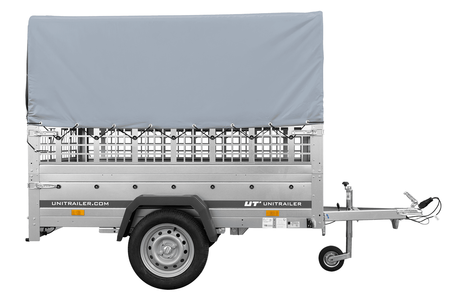 Remorque à un essieu sur ressorts UNITRAILER GARDEN 201/R KIPP 200x125 avec côtés, ridelles grillagées châssis H-800 et bâche grise