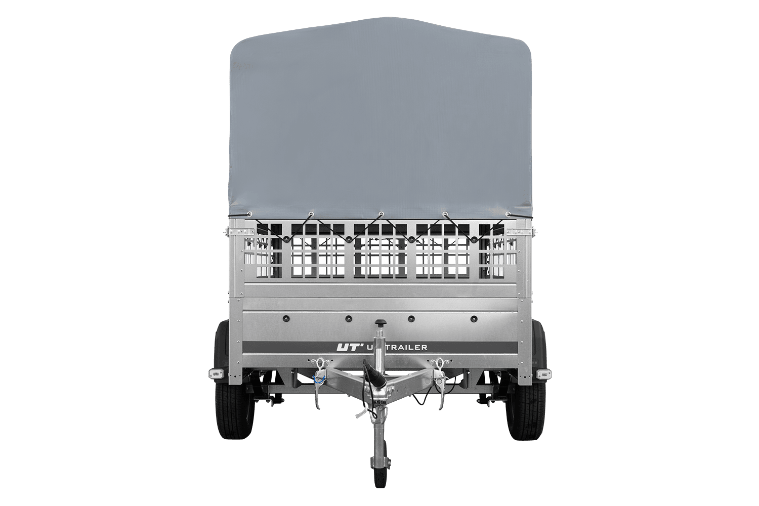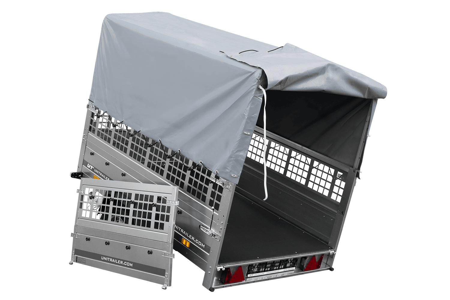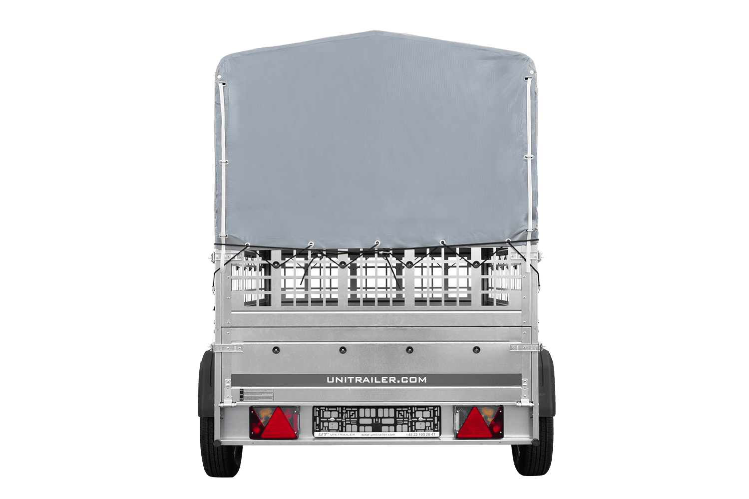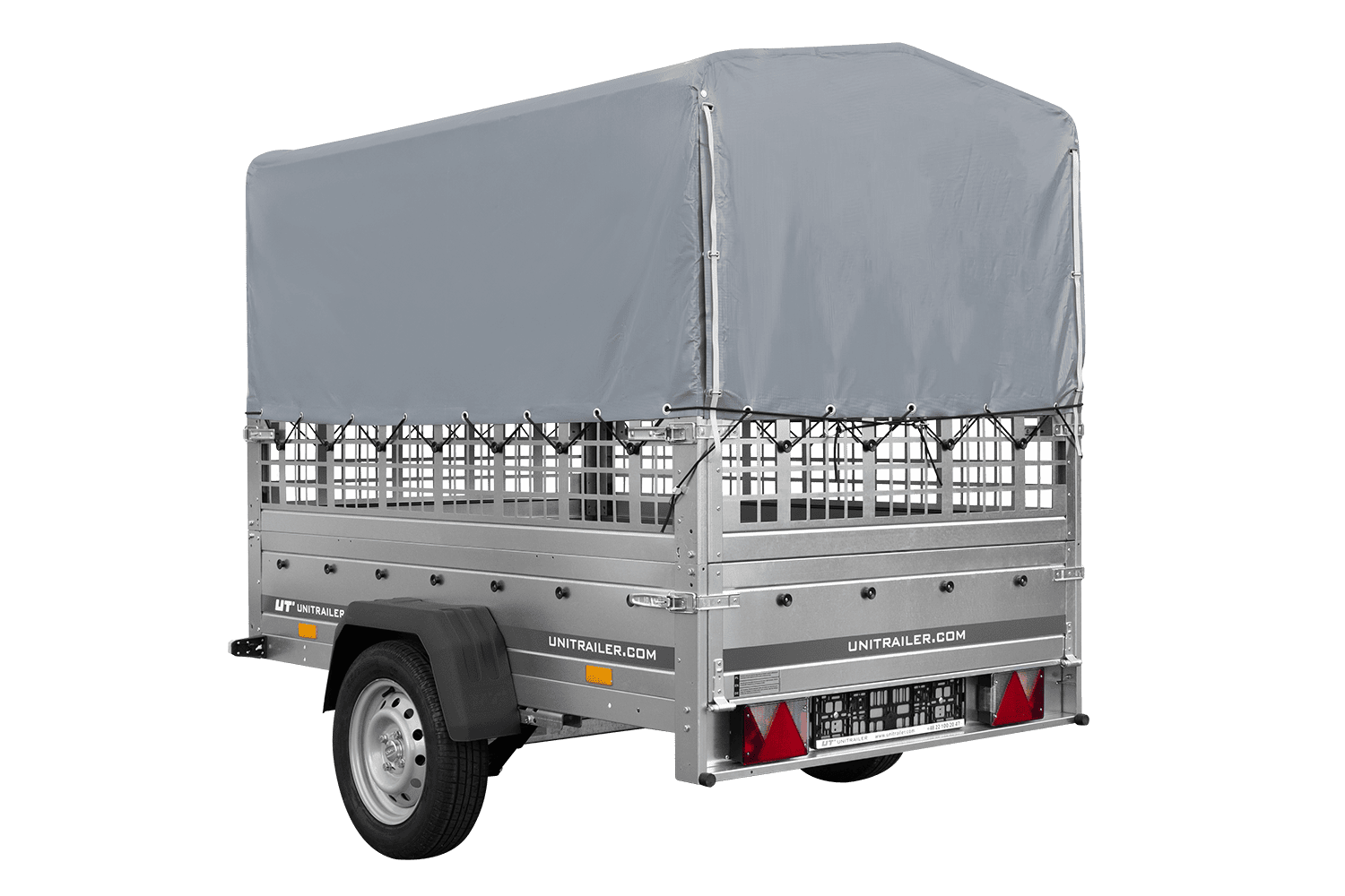 Remorque à un essieu sur ressorts UNITRAILER GARDEN 201/R KIPP 200x125 avec côtés, ridelles grillagées châssis H-800 et bâche grise