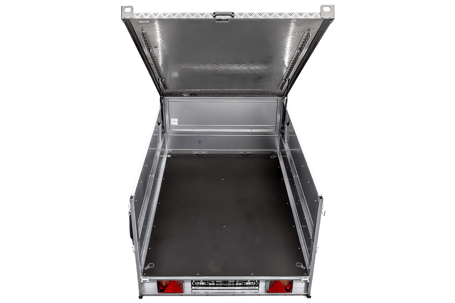 Le kit comprend des panneaux latéraux BIS qui augmentent la hauteur de l'espace de chargement, permettant ainsi d'accueillir des volumes de chargement plus importants. Autre avantage : le couvercle en aluminium, léger et extrêmement résistant. Renforcé sur les côtés pour une rigidité structurelle optimale, il ne compromet pas la capacité de charge de la remorque grâce à son faible poids (environ 50 kg). Équipé de vérins à gaz, le couvercle s'ouvre et se ferme facilement et sans effort. Ils maintiennent le couvercle ouvert, simplifiant considérablement les opérations de chargement et de déchargement. Un verrou à clé protège également le chargement contre le vol. La surface supérieure est dotée de rails de transport permettant la fixation d'une galerie de toit, d'un coffre ou d'un porte-vélos, augmentant ainsi la fonctionnalité de la remorque et sa capacité de chargement.