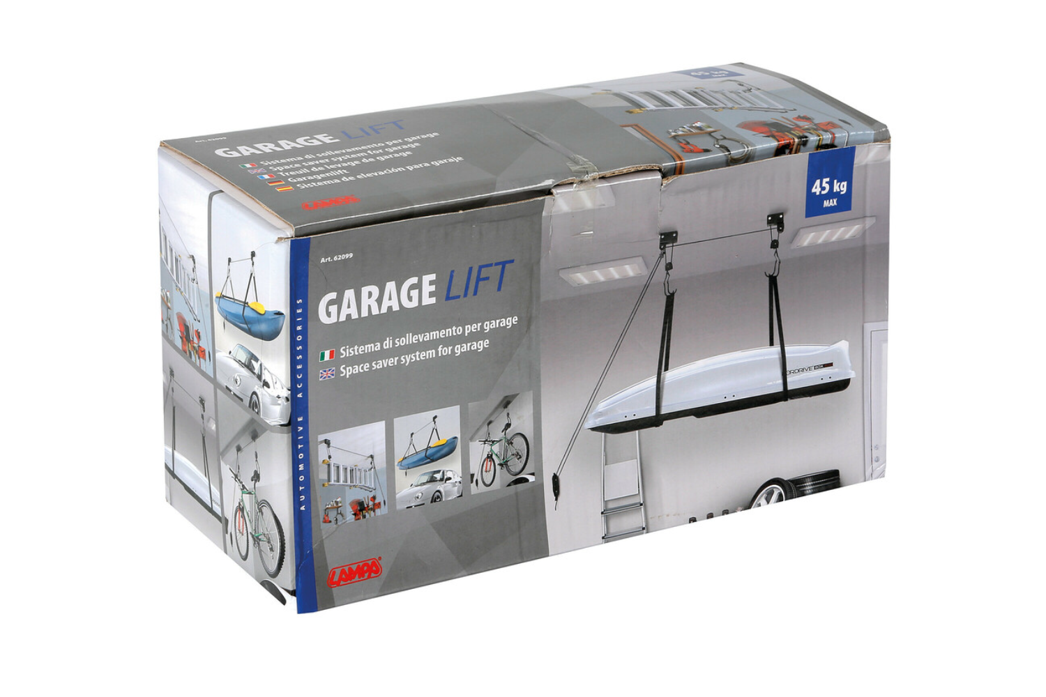 - Garage Lift système de rangement suspendu au plafond qui libère de l'espace dans votre garage. Permet de suspendre des coffres de toit, des vélos et des échelles jusqu'à 45 kg. Un kit de fixation est inclus. Idéal pour ranger et protéger votre équipement.