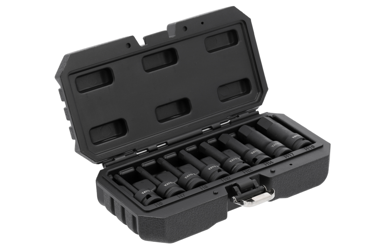 - Huit douilles hexagonales à impact YT-1066, idéales pour les travaux intensifs. Leur conception allongée facilite l'accès aux vis profondément encastrées, ce qui les rend adaptées aux applications automobiles et industrielles. Elles sont idéales pour la r
