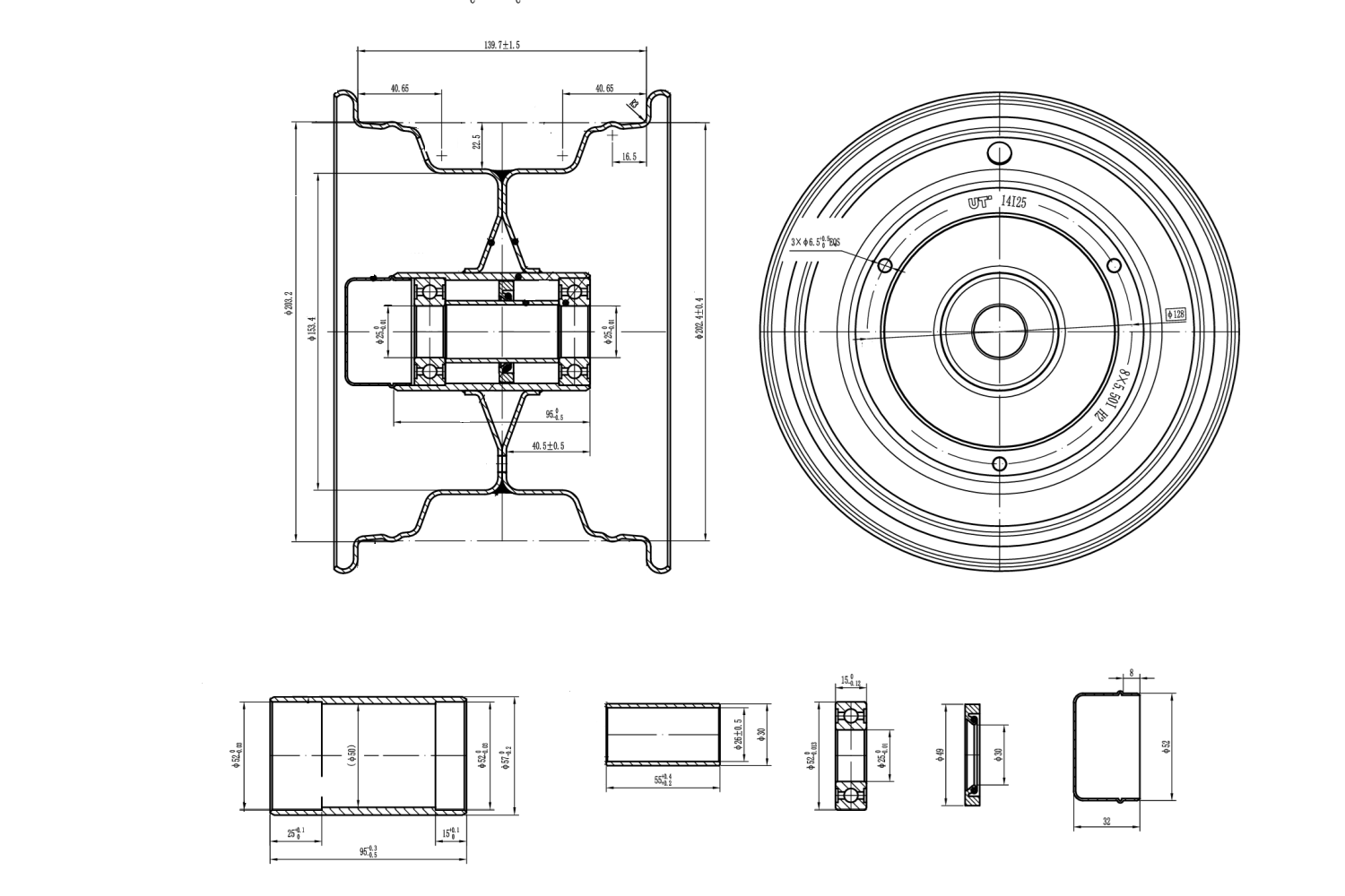 Ce modèle est équipé de deux roulements étanches 6205-2RS , garantissant un fonctionnement fluide et une protection contre la poussière et l'humidité. La longueur du moyeu est de 95 mm , dont environ 55 mm entre les roulements, et son diamètre extérieur est de 57 mm . L'entraxe de fixation de 3x128 signifie que la jante possède trois trous disposés sur un cercle de 128 mm de diamètre. L'entraxe des boulons est un paramètre essentiel lors du choix d'une jante pour assurer un montage correct sur le moyeu du véhicule.