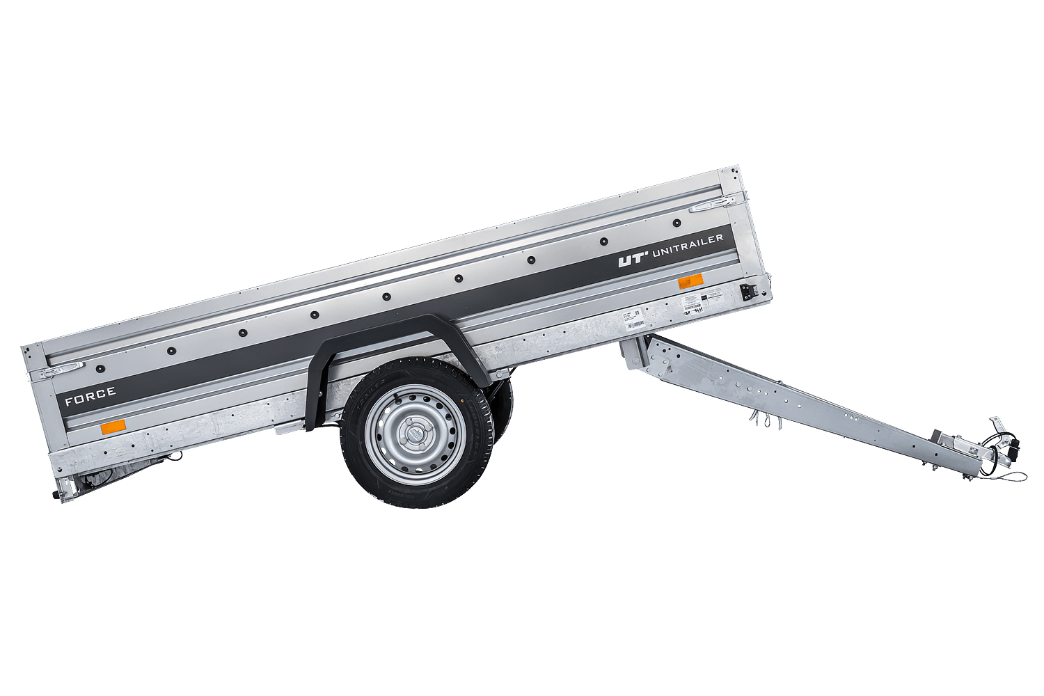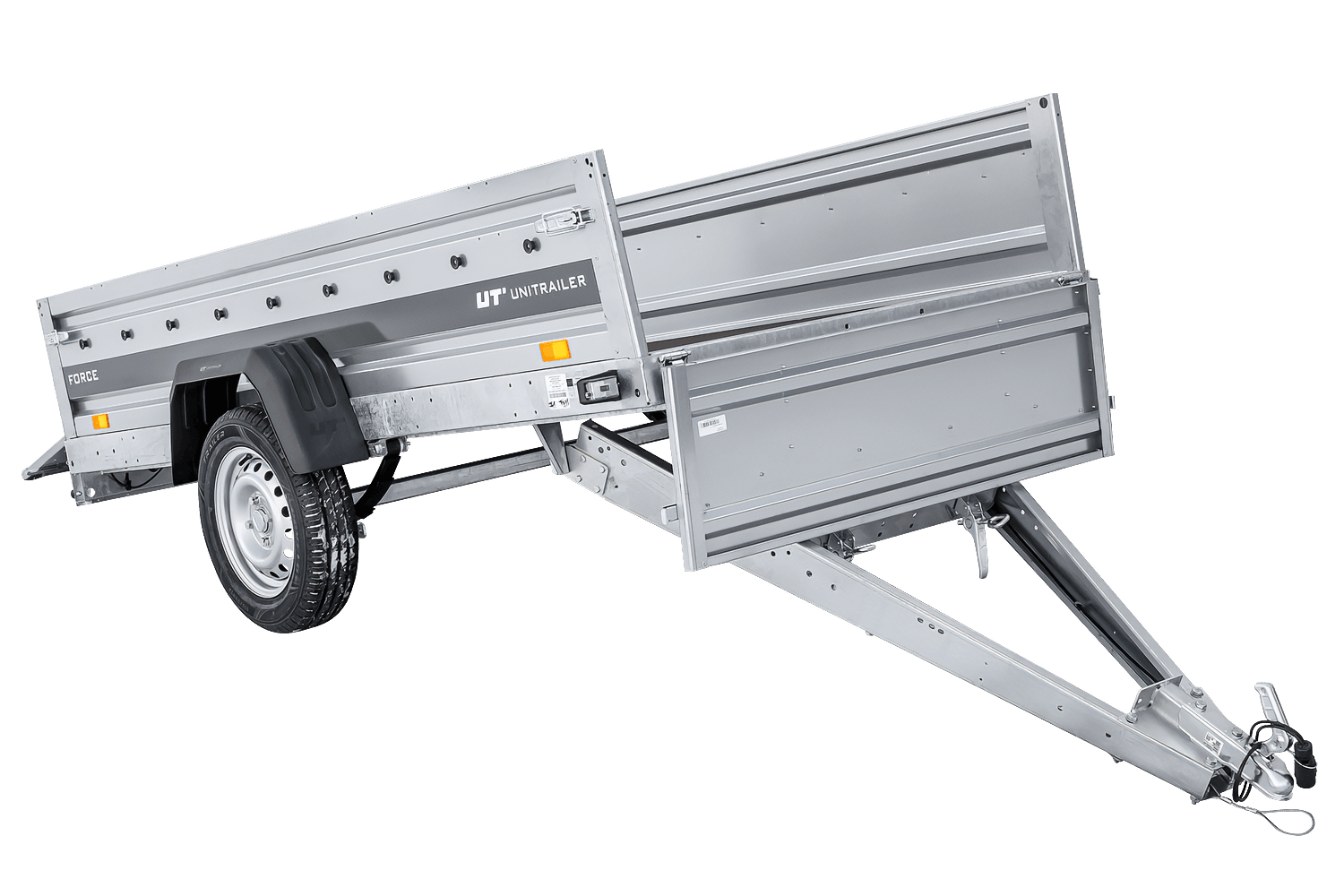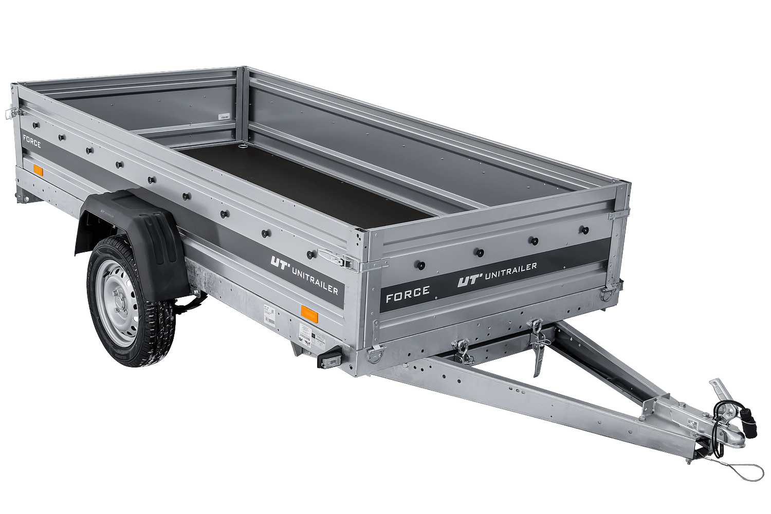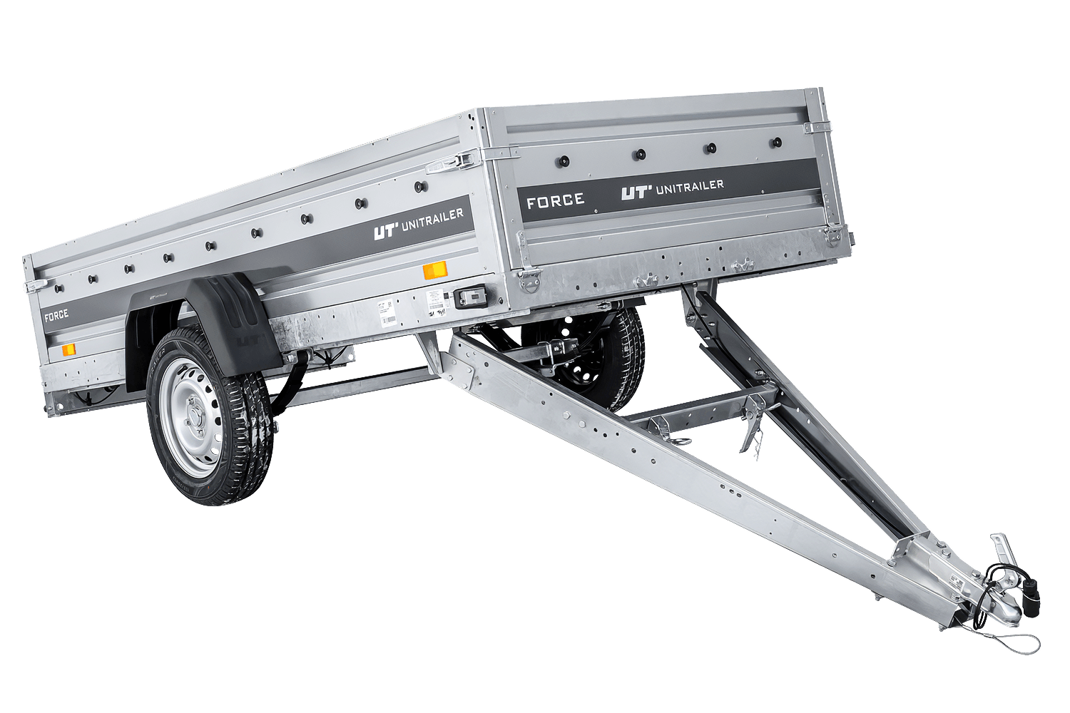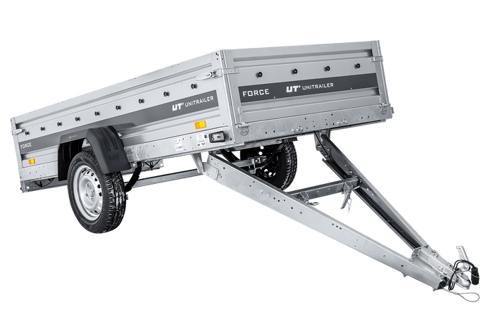 - Remorque UNITRAILER FORCE 264/R KIPP 264x125 cm à suspension à ressorts. dotée Surface de chargement agrandie, idéale pour le transport de charges longues et lourdes. Construction soudée et ses ridelles de 40 cm de haut sont entièrement amovibles.