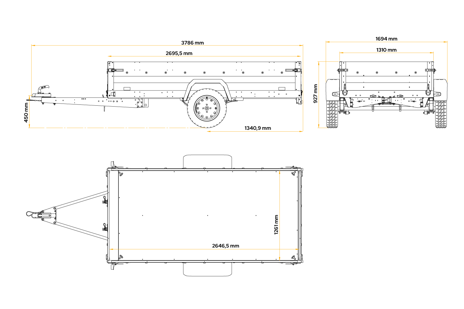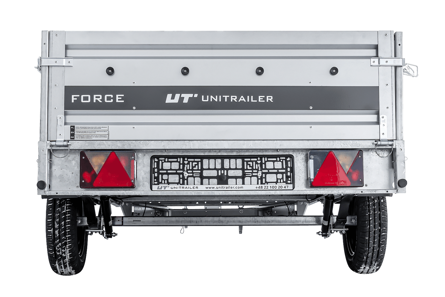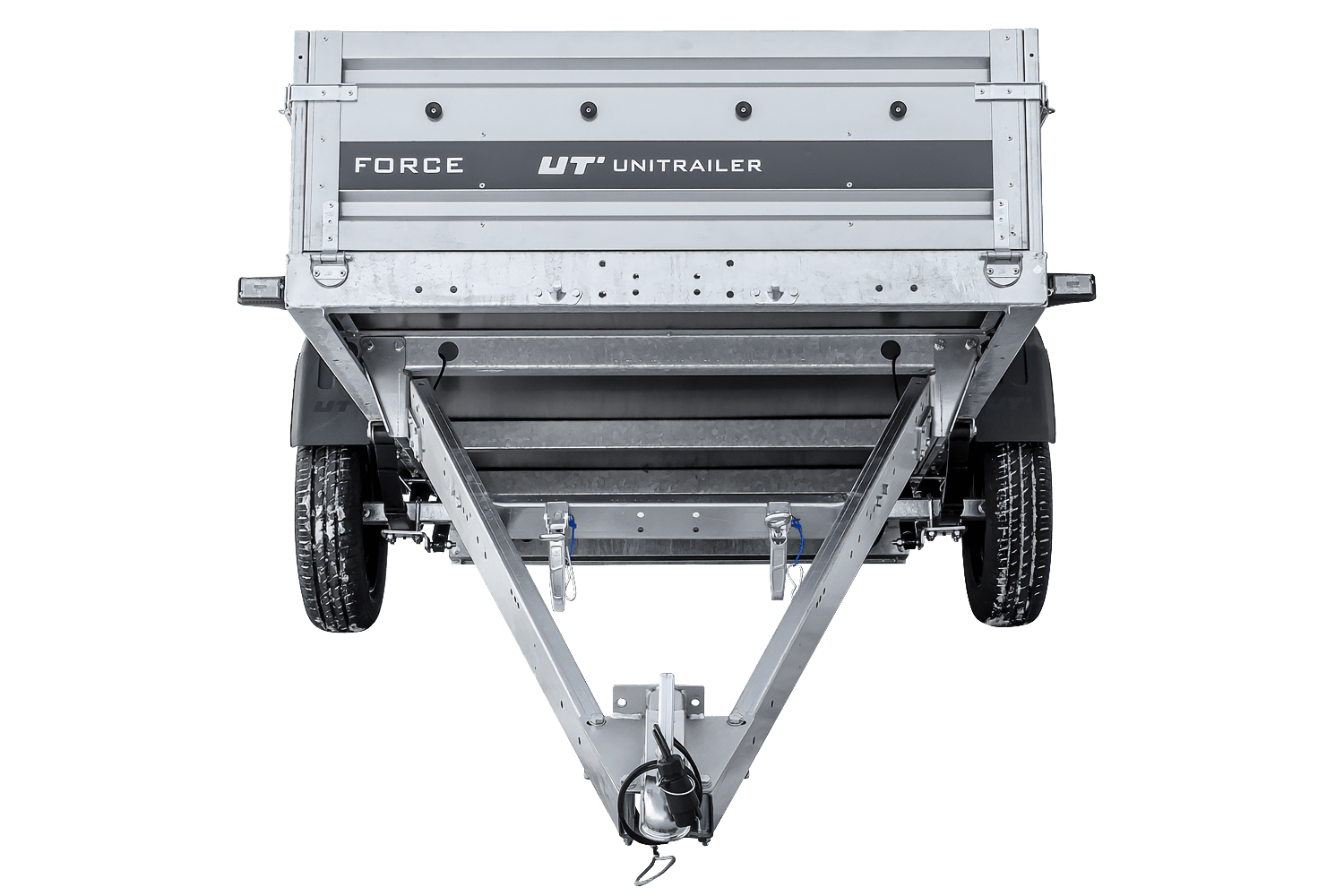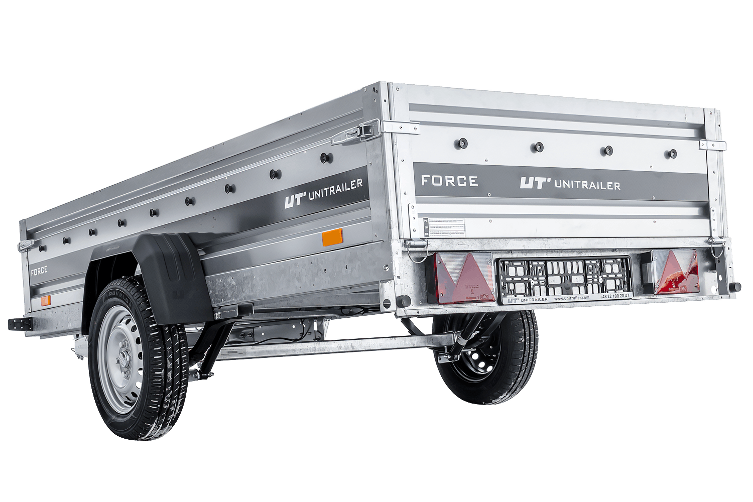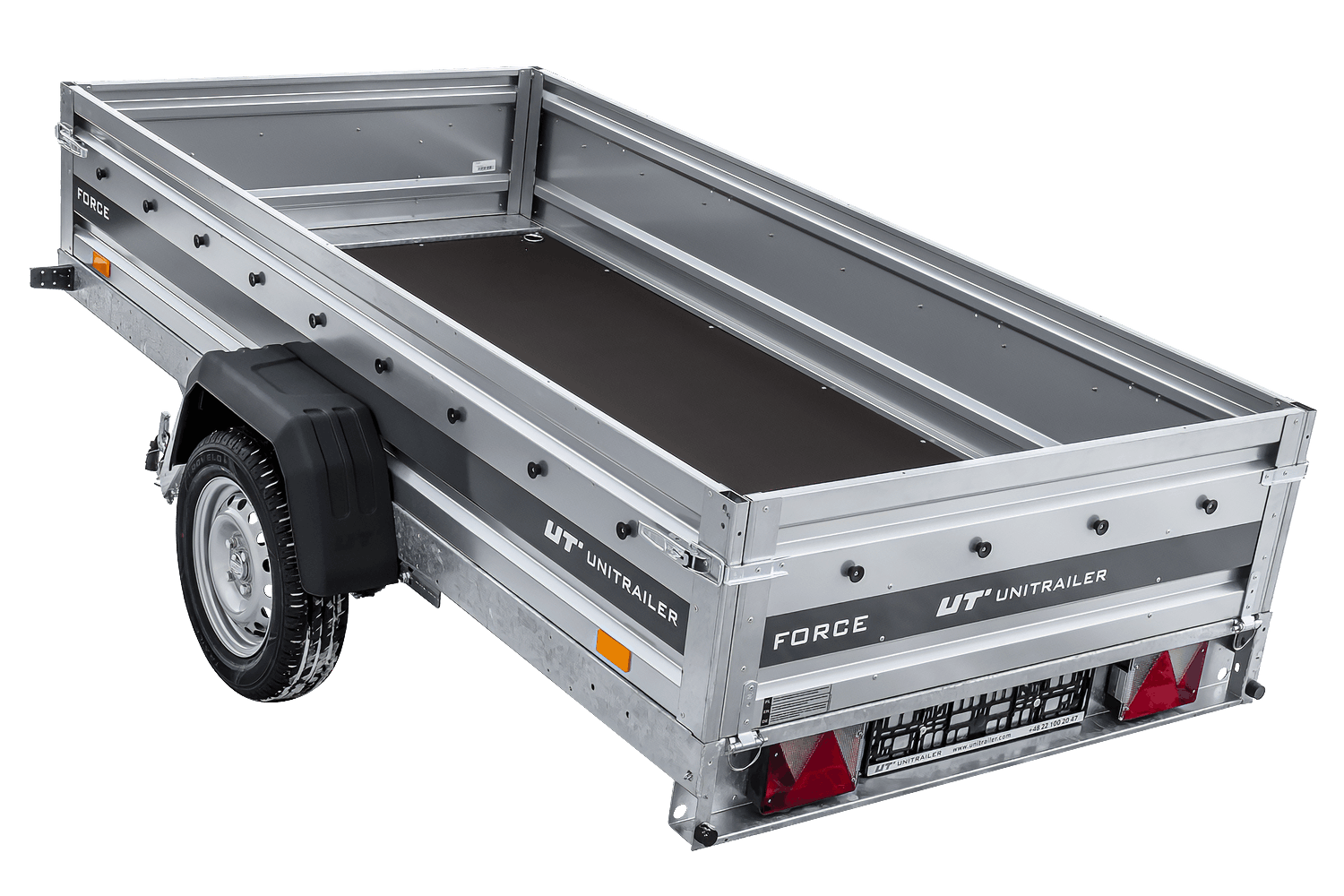 - Remorque UNITRAILER FORCE 264/R KIPP 264x125 cm à suspension à ressorts. dotée Surface de chargement agrandie, idéale pour le transport de charges longues et lourdes. Construction soudée et ses ridelles de 40 cm de haut sont entièrement amovibles.