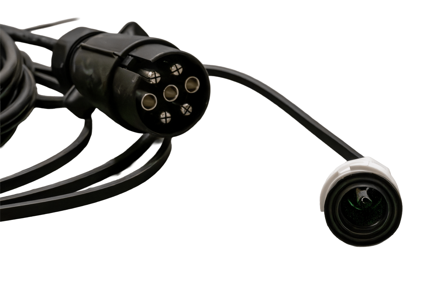 - Le système électrique MANTES OUTLET est doté d'un câble principal de 4,7 mètres terminé par une prise à 7 broches. Le faisceau assure le bon fonctionnement de l'éclairage de la remorque, tandis que les connecteurs à baïonnette AJ.BA à 5 et 2 broches perme