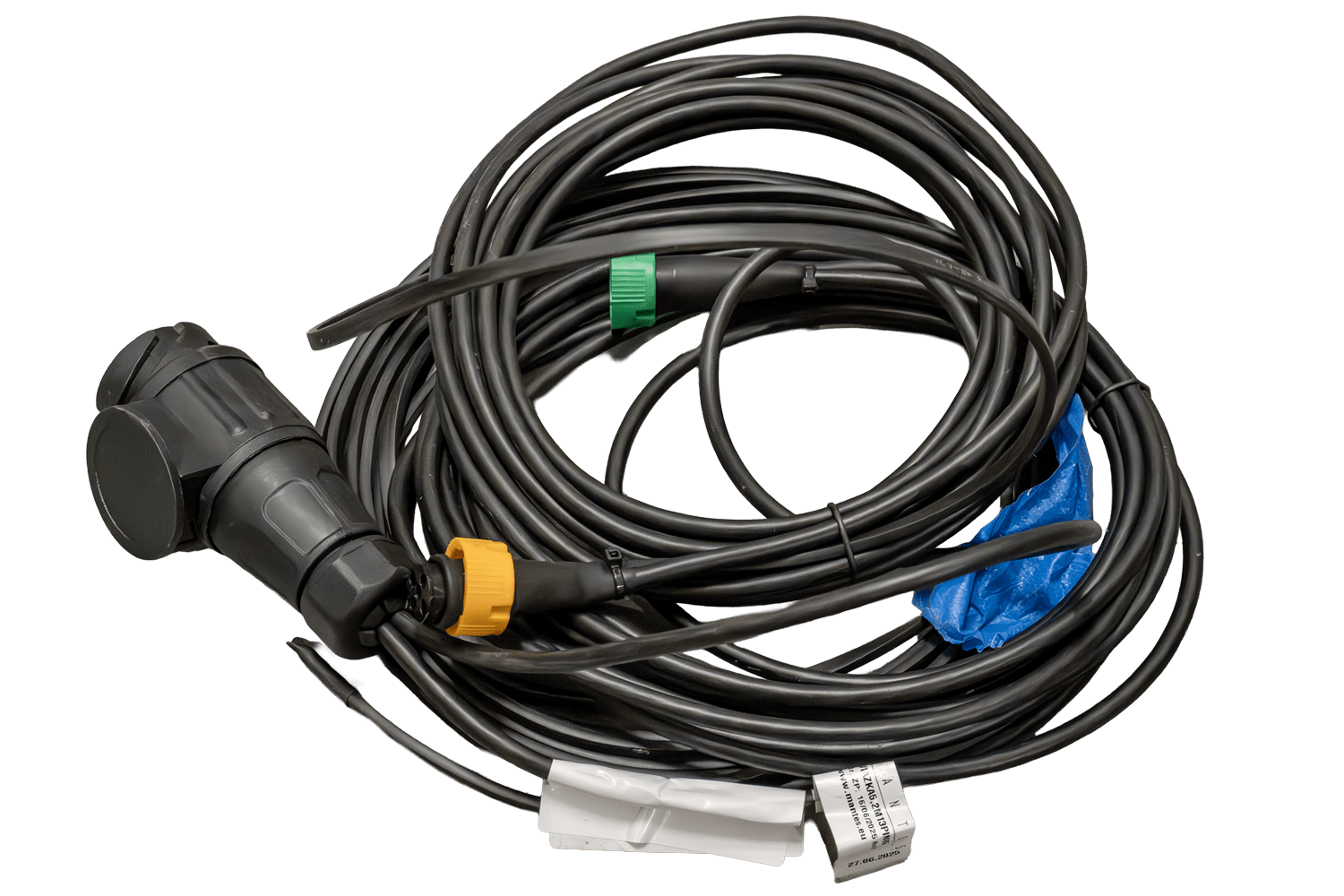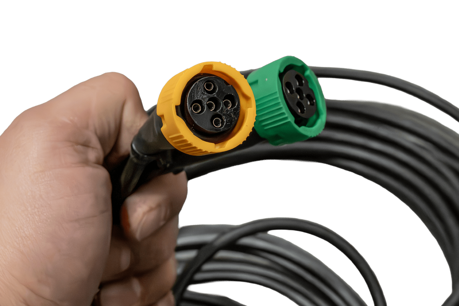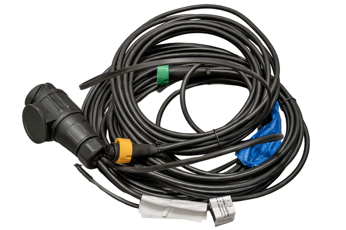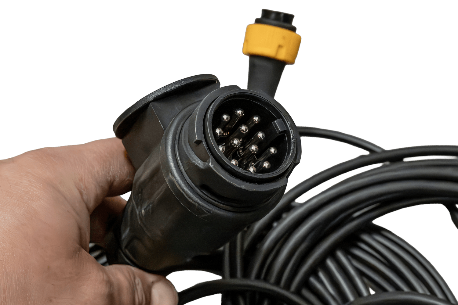- Le système électrique MANTES OUTLET est doté d'un câble de 5,2 mètres terminé par une prise à 13 broches. Le faisceau assure un fonctionnement optimal de l'éclairage sur les semi-remorques et les remorques plateaux, tandis que les connecteurs à baïonnette