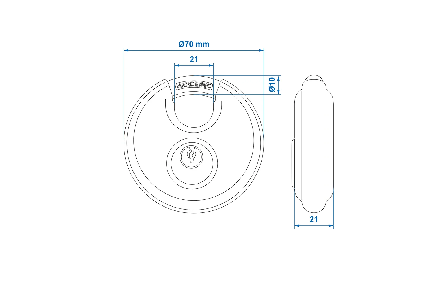 Les cadenas ont un diamètre extérieur de 70 mm , un diamètre d'anse de 10 mm , un dégagement d'anse de 21 mm et une épaisseur de 21 mm . Leur construction robuste et leur résistance aux intempéries les rendent adaptés à une utilisation intérieure et extérieure.
