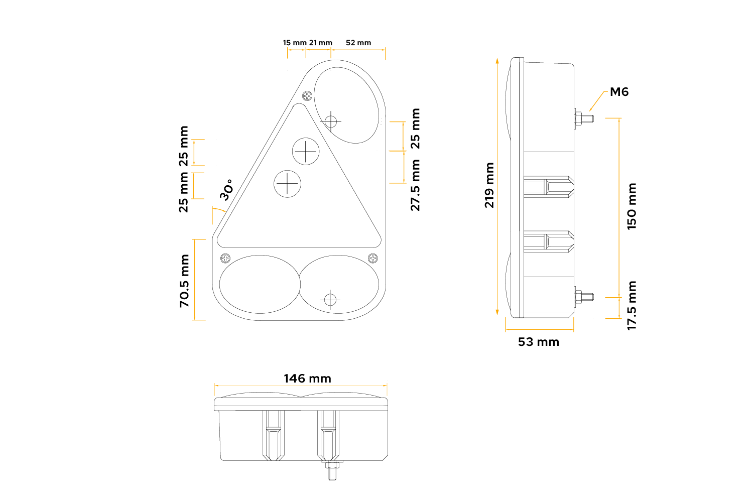 Le feu arrière Earpoint III d'ASPÖCK est destiné à être installé sur le côté gauche du véhicule et a les dimensions suivantes : largeur 146 mm, hauteur 219 mm, profondeur 53 mm. Equipé d'un connecteur à baïonnette 5 broches, il permet une installation facile et rapide dans les remorques, les bus et les dépanneuses.