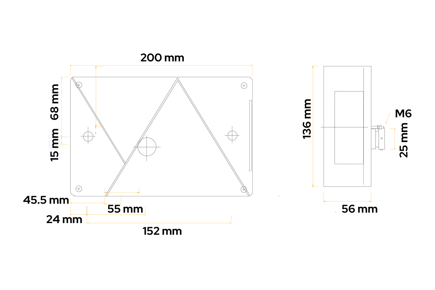 Le feu arrière Multipoint IV d'ASPÖCK est destiné à être installé sur le côté gauche du véhicule et a les dimensions suivantes : largeur 200 mm, hauteur 136 mm, profondeur 56 mm . Equipé d'un connecteur à baïonnette 5 broches, il permet une installation facile et rapide dans les remorques, bus et dépanneuses.