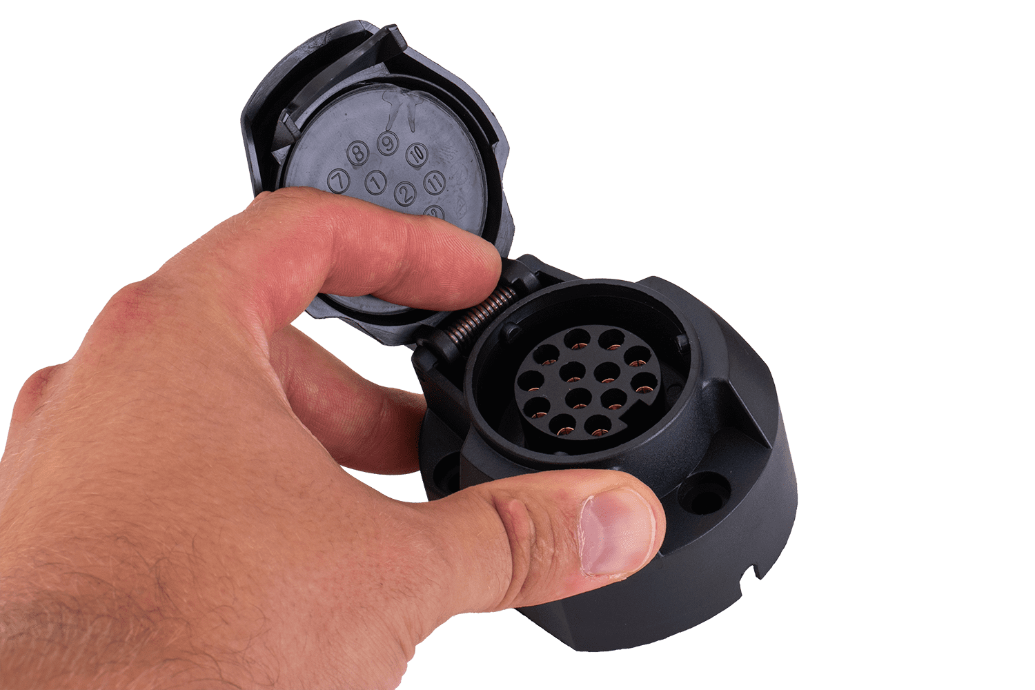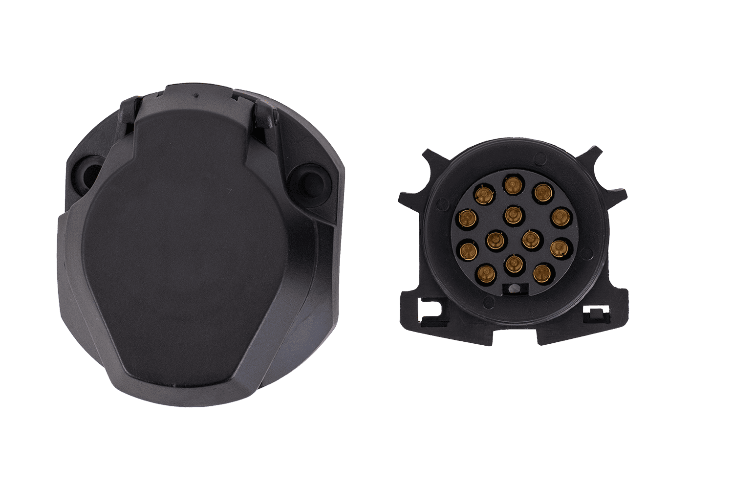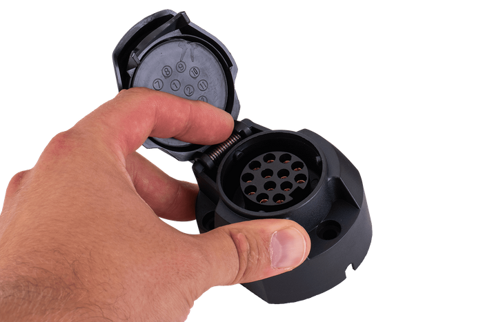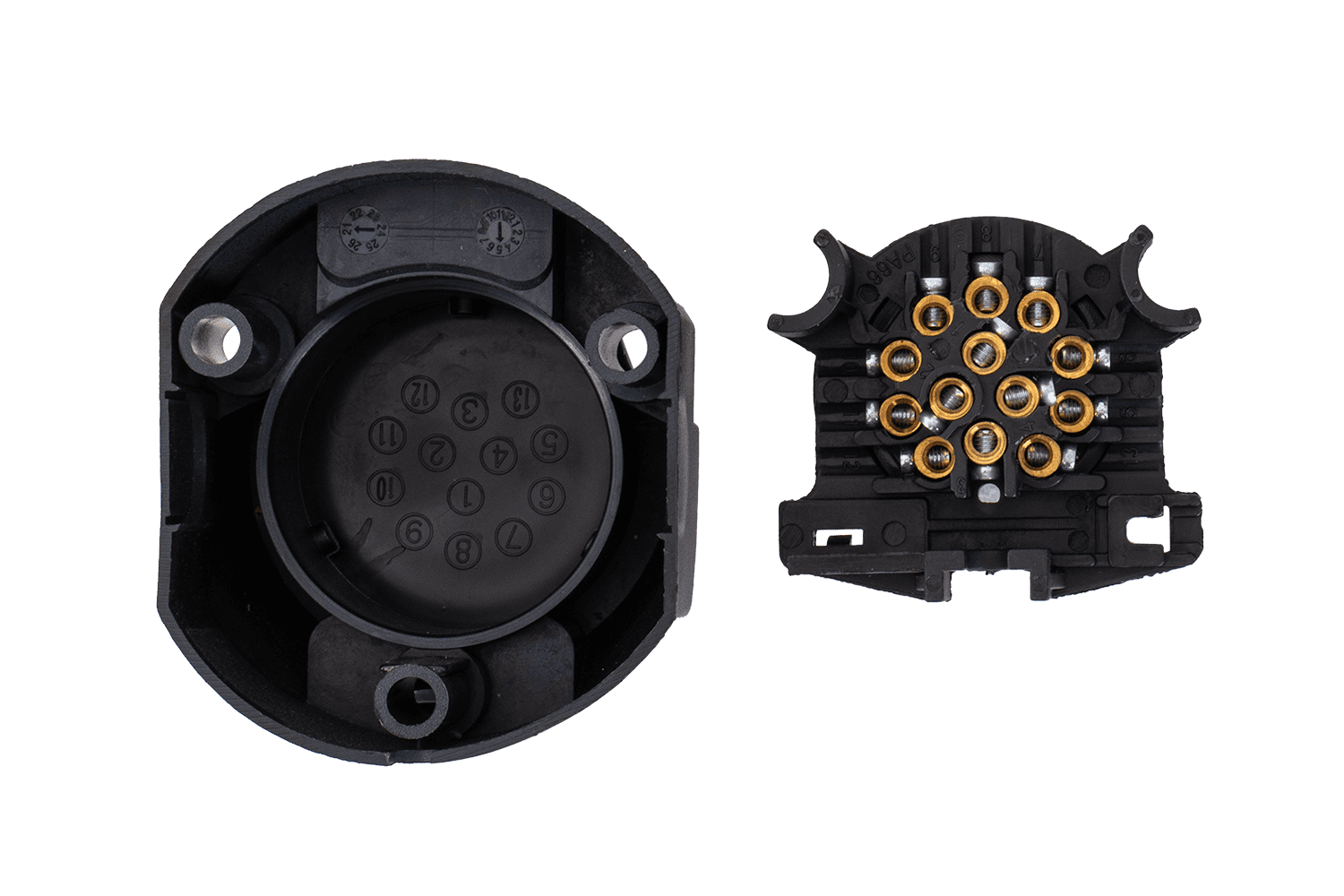 - Cette prise 13 broches 12 V, conçue pour être montée sur la barre de remorquage d'un véhicule, sert à brancher une caravane ou une autre remorque de plus de 750 kg. Elle assure une connexion électrique fiable entre le véhicule et la remorque.