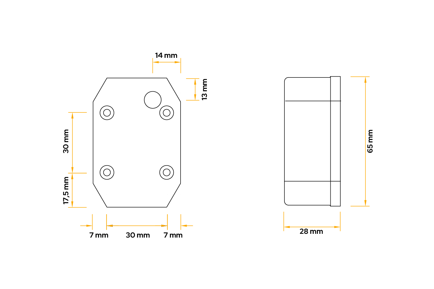 Le feu de gabarit FLEXIPOINT I d'ASPÖCK, conçu pour être monté sur le côté gauche et droit du véhicule, se caractérise par les dimensions suivantes : largeur 44 mm, hauteur 65 mm, profondeur 28 mm. Equipé d'un support de montage de 100 mm et d'un câble plat de 0,5 m, il permet une installation facile et rapide et peut être utilisé dans les véhicules de livraison, les remorques, les semi-remorques et les camping-cars .