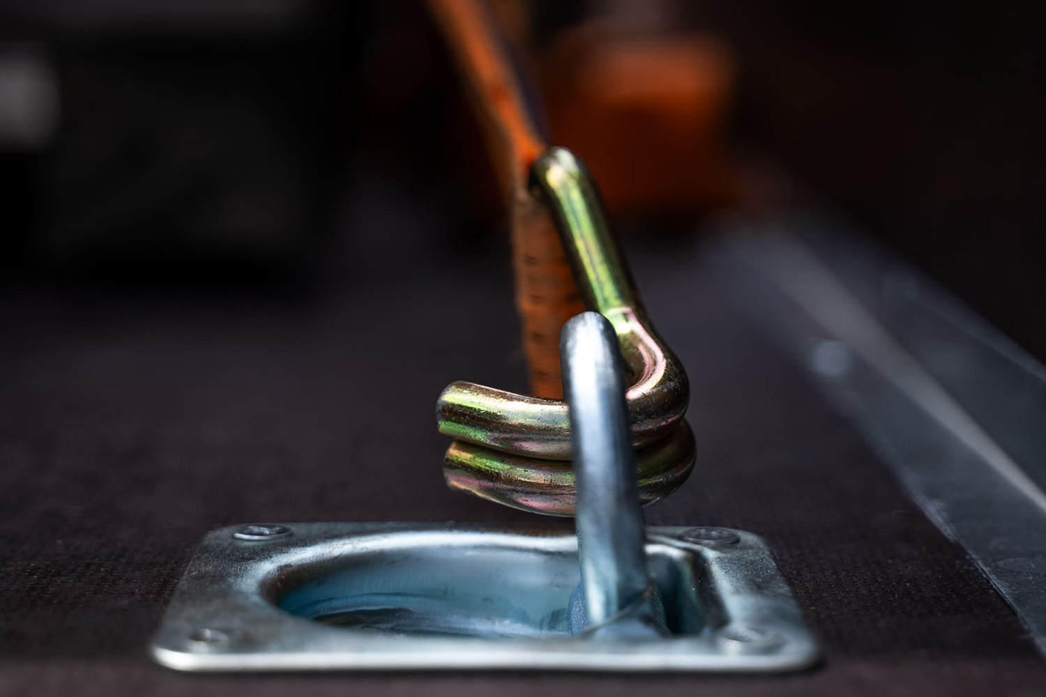 • Un kit de quatre sangles de transport à trois points d'une résistance de 4 tonnes. La longueur de 3 m et la largeur de 50 mm offrent une surface d'appui optimale et le système à trois points permet une fixation stable du véhicule sur la remorque.
