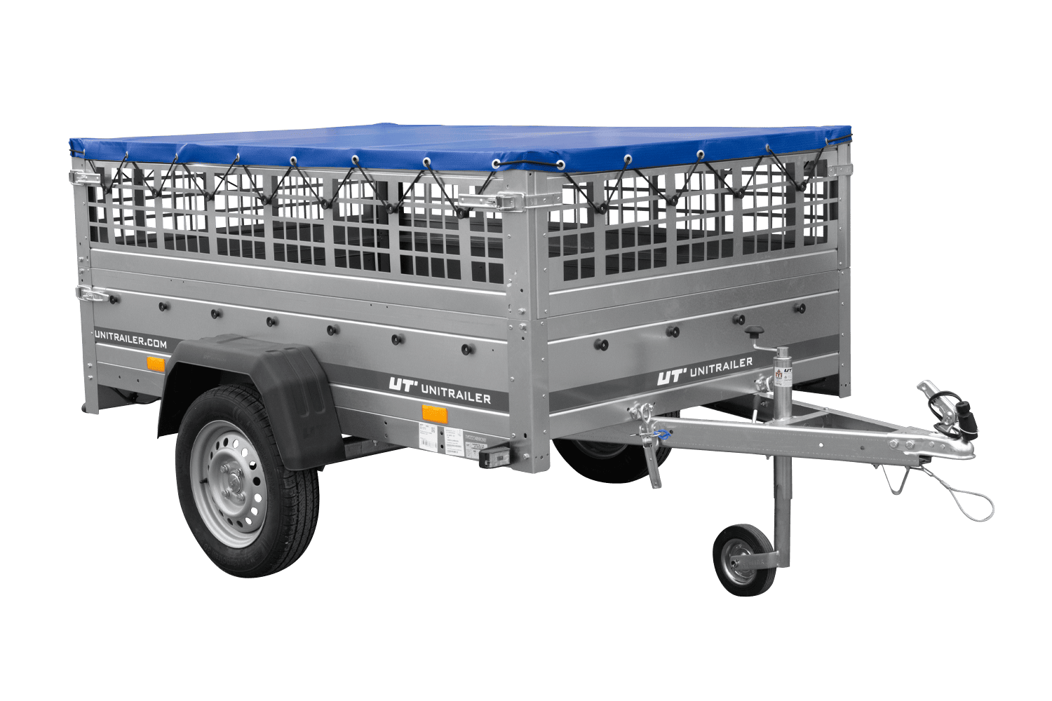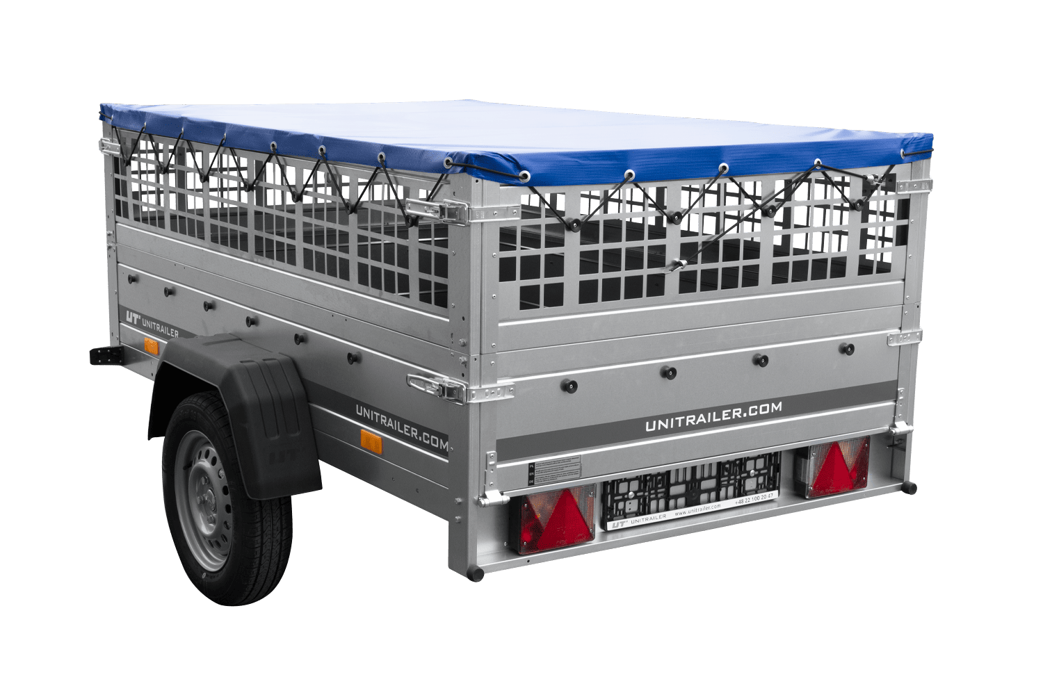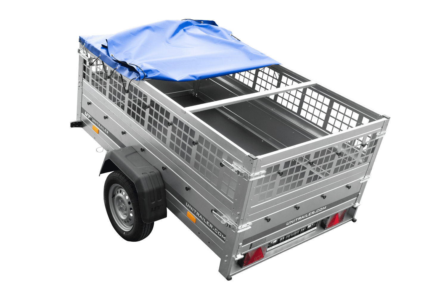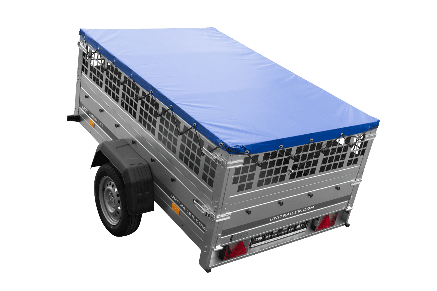 Remorque à un essieu 200x125 UNITRAILER GARDEN 201 KIPP avec côtés en filet, châssis H-0 et bâche bleue