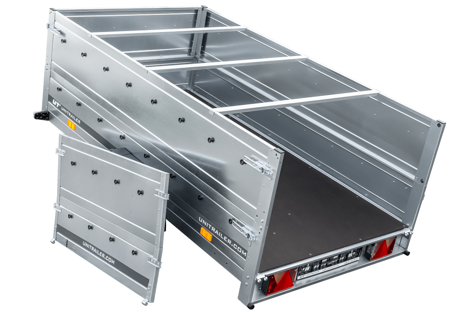 En utilisant les rehausses de ridelles supplémentaires et une bâche plate, vous obtenez jusqu'à 70 cm de hauteur de la surface de transport. Vous pouvez également monter des supports latéraux, dispositifs de fixation sur le plancher, un filet de fixation de charge ou acheter une roue de secours ou des cales de roue. Il est très facile d'adapter votre remorque à vos besoins de manière très facile.