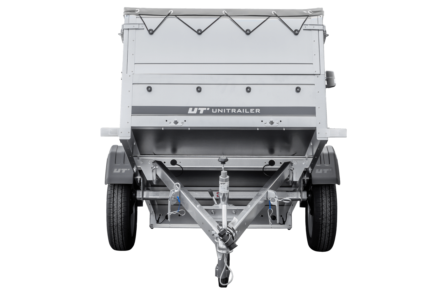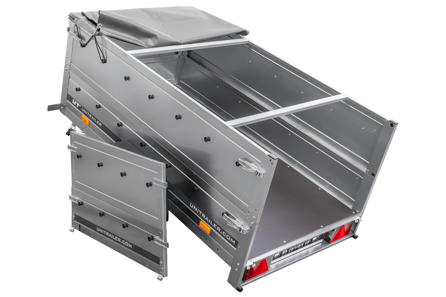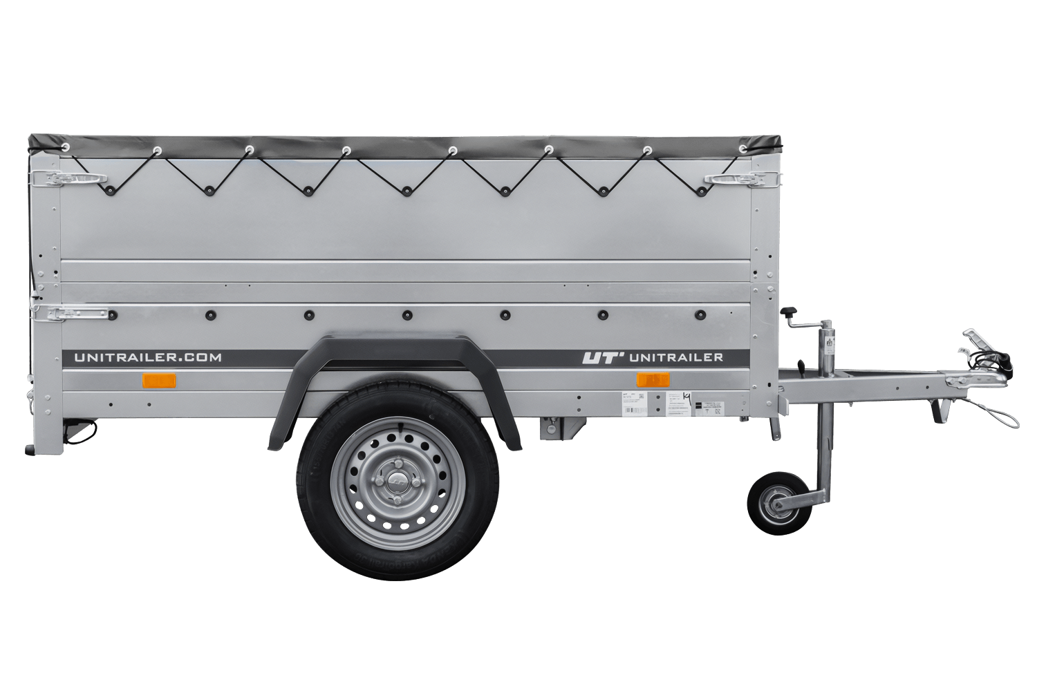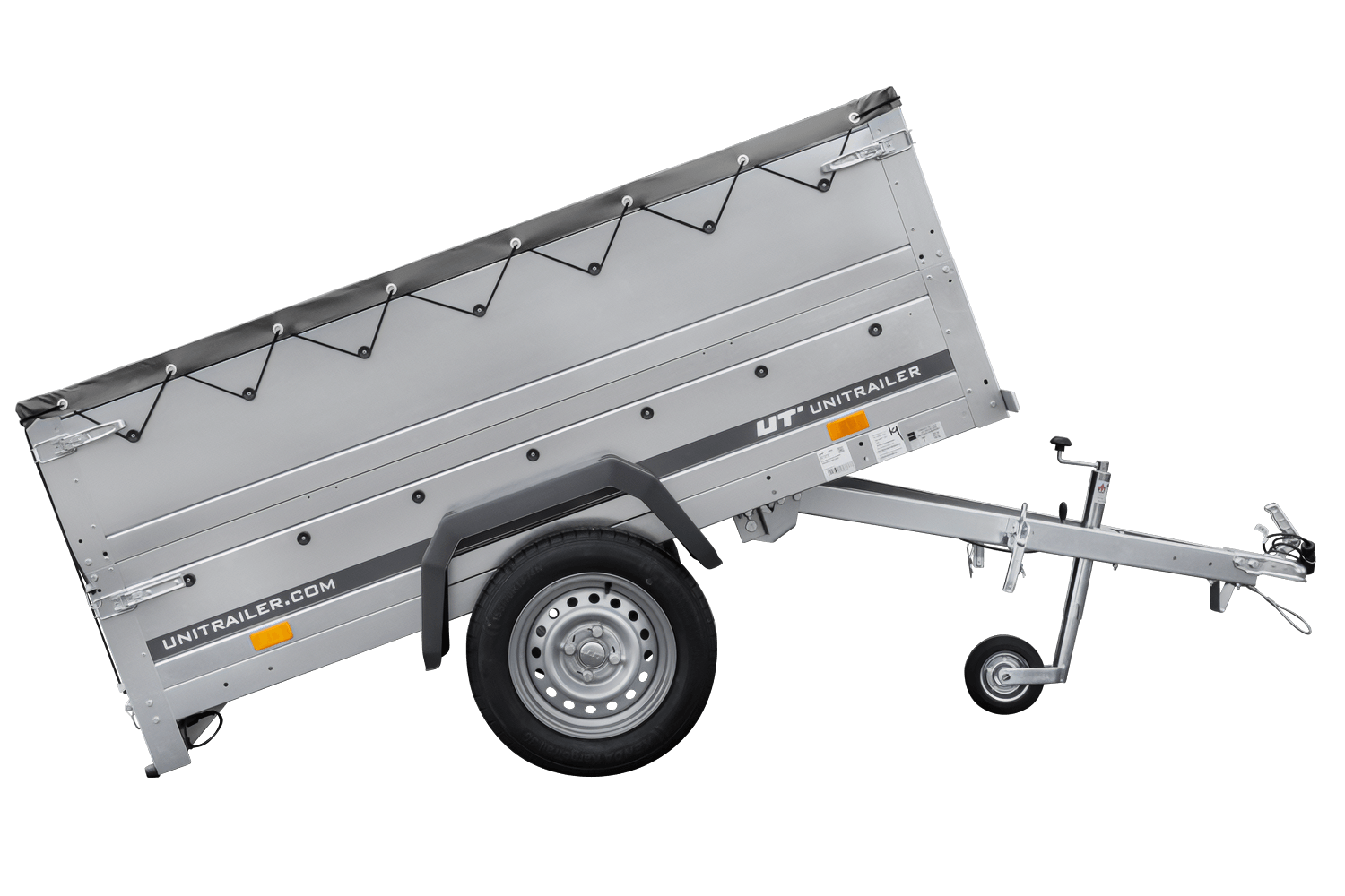 Garden Trailer 200 Kipp avec Garden Trailer 200 Kipp avec bâche plate grise, côtés BIS, châssis H-0 et roue jockey vue générale