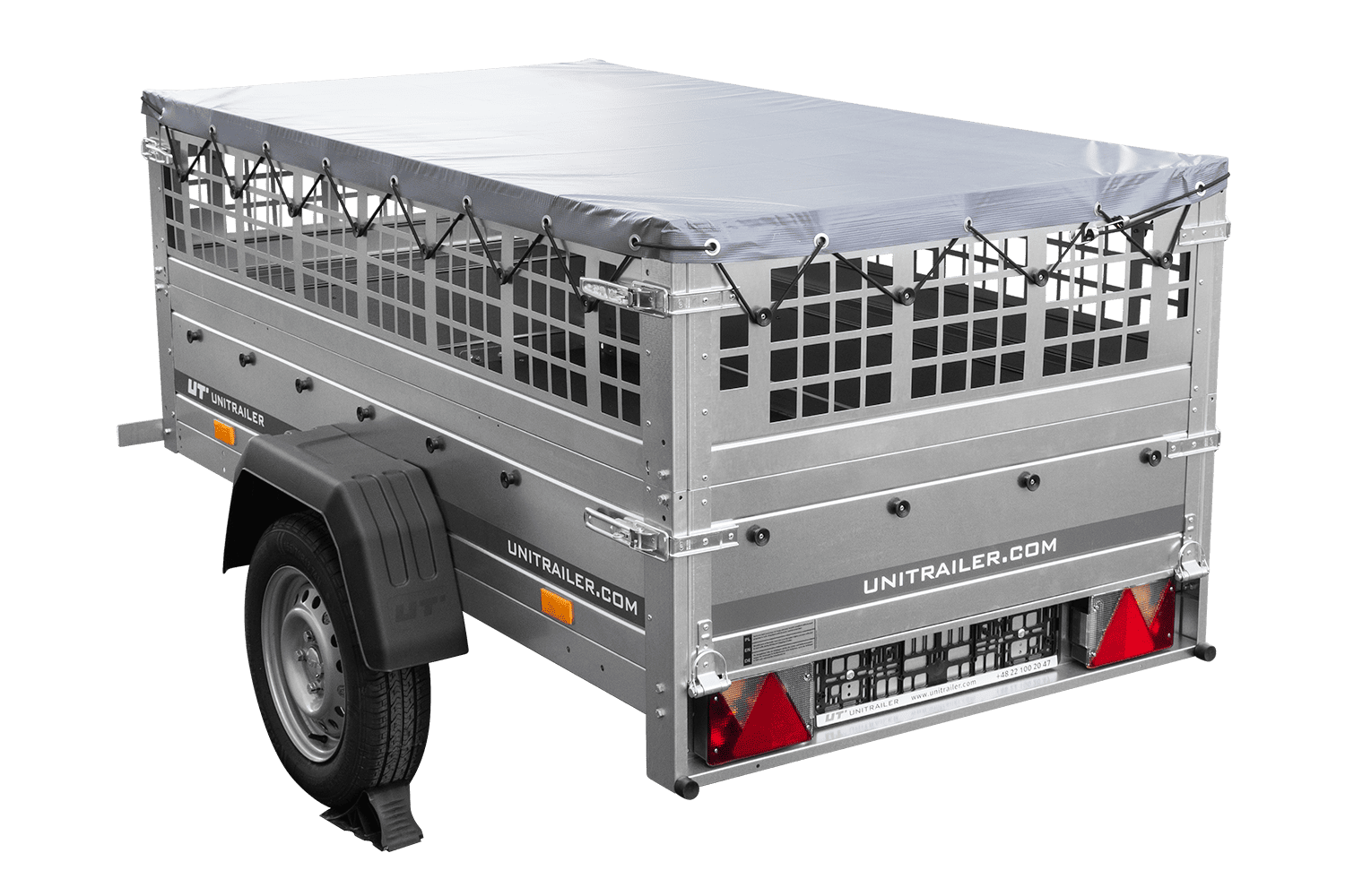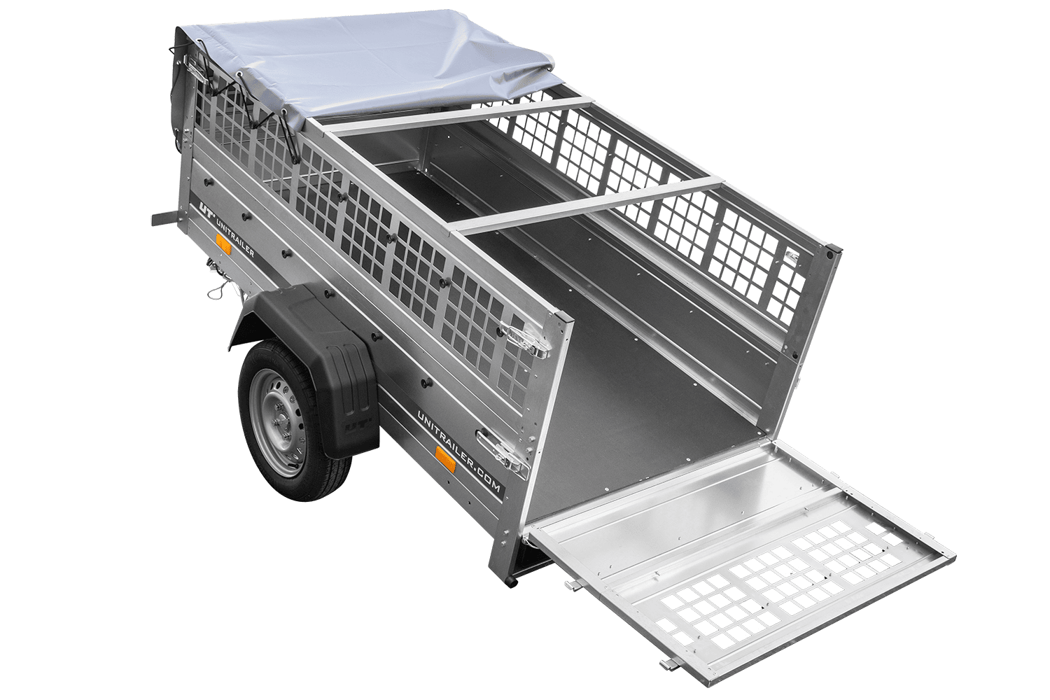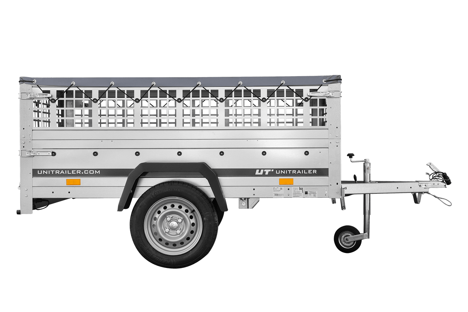 - Remorque grillagée UNITRAILER du modèle Garden Trailer 200 KIPP avec timon pliable. Surface de transport de 200x106 cm. Hauteur totale de 70 cm (incluant bâche et ridelles). PTAC 300-750 kg.